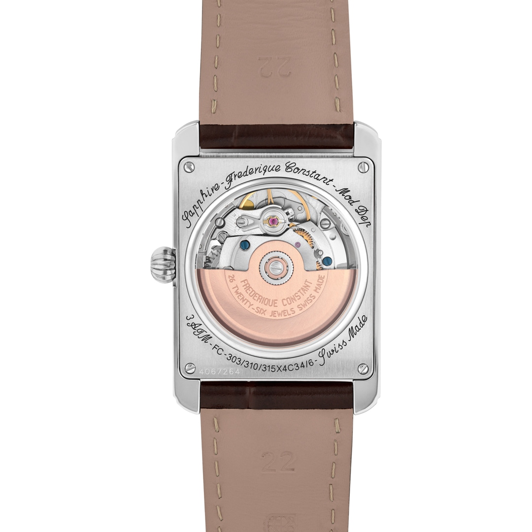 La Classics Carrée Automatic affiche un look élégant et rétro des années 1920, en parfaite harmonie avec la philosophie de la marque. Elle évoque le raffinement des événements mondains d’autrefois. En y ajoutant des caractéristiques propres à Frederique Constant, la Maison réaffirme son savoir-faire horloger classique en faisant revivre une forme emblématique.
