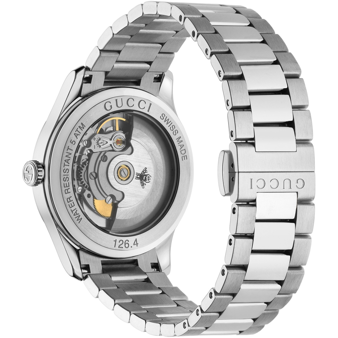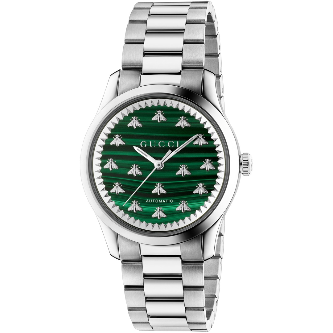 Cette montre automatique, qui fait partie de la collection G-Timeless, est dotée d’un cadran en malachite verte, dont les repères argentés prennent la forme de l’abeille Gucci, un code emblématique de la Maison.