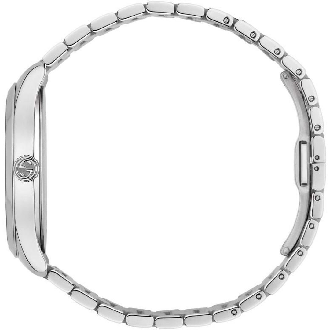Gucci introduit de nouvelles interprétations d'une montre classique dans la ligne G-Timeless. Les modèles combinent l'aspect d'une montre Swiss Made confortable avec de nouveaux motifs maison tels que l'abeille, l'étoile et le cœur comme indices. Le G-Timeless de Gucci, tout comme son porteur, est simple et direct, gracieux, confiant et élégant. Le design de cette montre combine le style traditionnel avec des éléments du nouveau look de Gucci. Le design spécial du cadran est sans conteste Gucci : il affiche les motifs de la maison, comme une abeille et une étoile, ainsi que des éléments typiques qui ornent habituellement le fond du boîtier. Le point culminant de cette montre à la mode est une abeille Gucci en argent au centre du cadran. Le bracelet en acier inoxydable est très confortable à porter. Avec son élégance moderne et classique, ce G-Timeless est un accessoire idéal pour les hommes et les femmes.