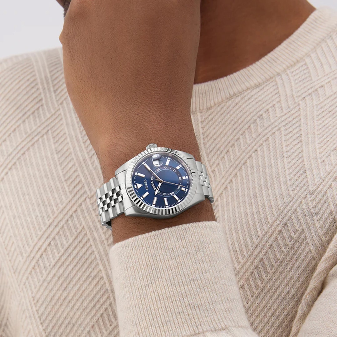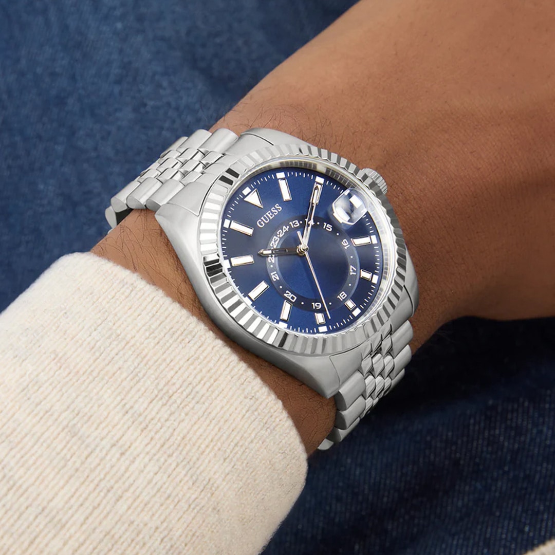 Ce style vestimentaire frais et élégant rayonne d'une sophistication intemporelle ! Il est doté d'un boîtier argenté de 42 mm en acier inoxydable brossé et poli, avec un bracelet de style Jubilé. Le cadran bleu brossé soleil, avec guichet dateur et affichage 24 heures, est encadré par une lunette à bordure cannelée qui complète ce magnifique garde-temps. Avec son verre minéral, son mouvement analogique à quartz précis et son étanchéité à 50 mètres, cette montre polyvalente est parfaite pour l'homme qui exige à la fois style et substance dans sa collection de montres.