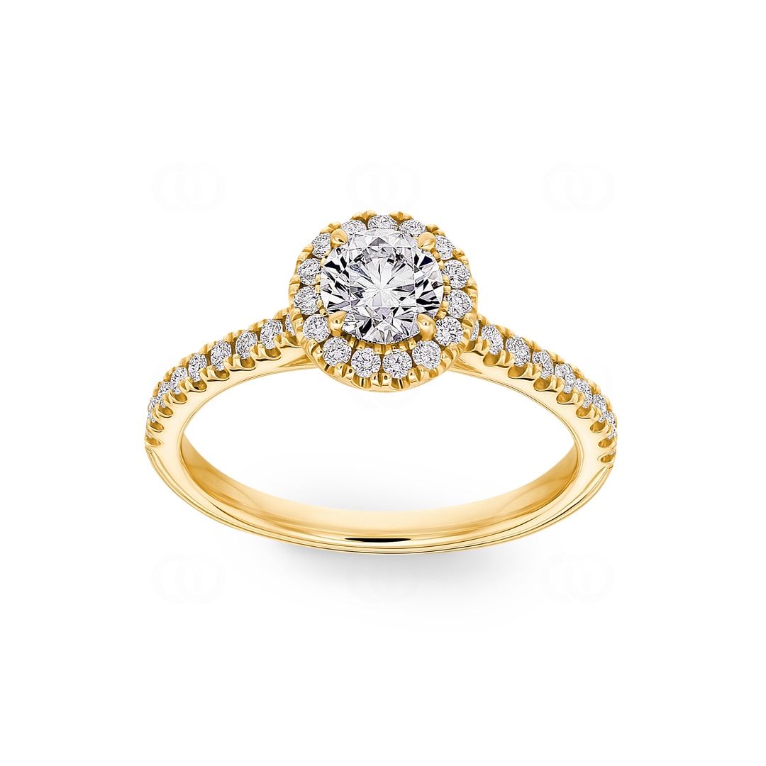 Célébrez votre amour avec cette exquise bague de fiançailles en halo en or jaune 18 carats, qui incarne l'élégance et le raffinement à l'état pur. Au centre, un impressionnant diamant taille brillant de 0,50 carat brille de mille feux. Son éclat lumineux et ses facettes harmonieuses symbolisent l'éternité de votre union.