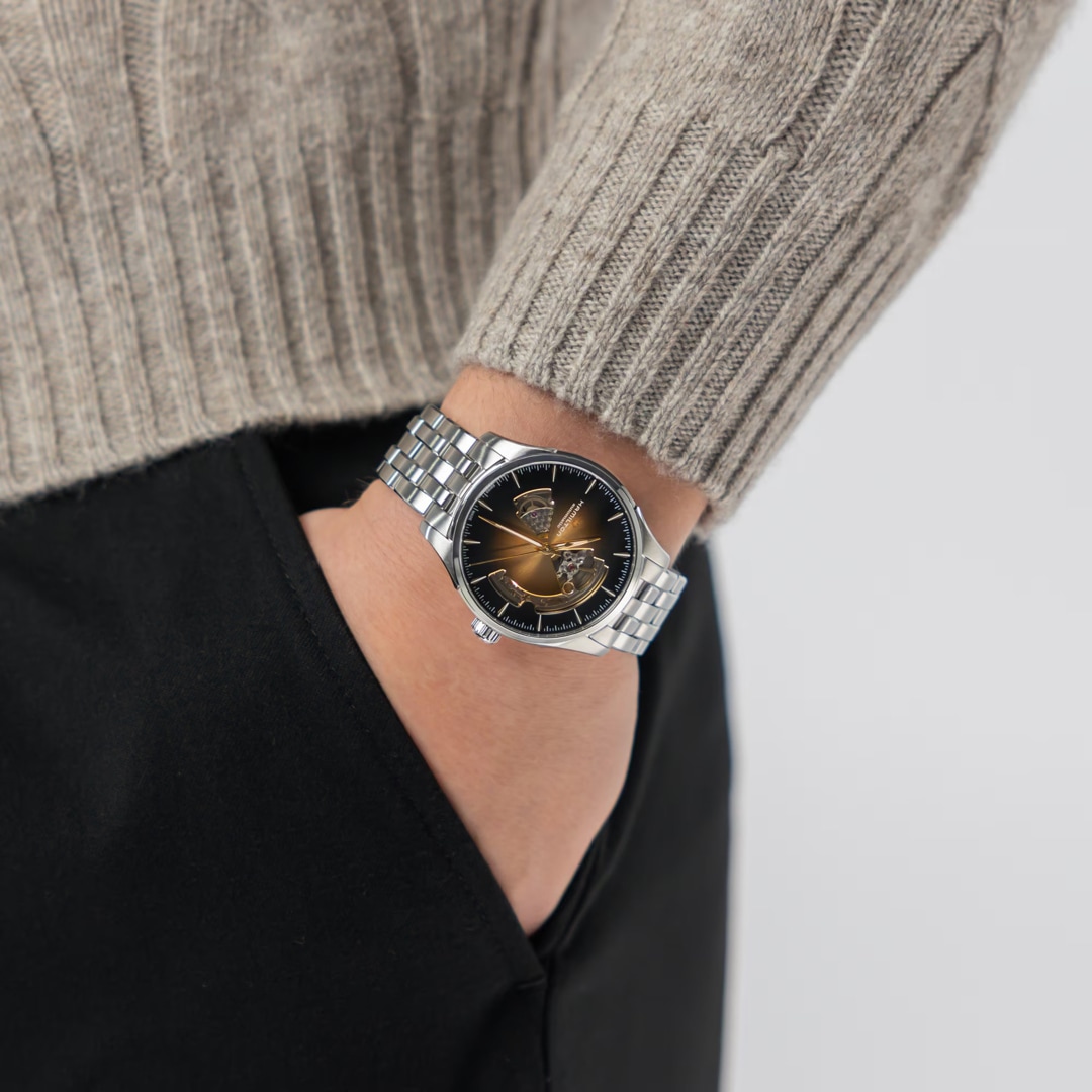 La Jazzmaster Open Heart 40 mm associe son cadran brossé soleillé chaleureux à un bracelet en acier inoxydable pour un look à la fois raffiné et contemporain. Des détails fumés ajoutent de la profondeur au design à cœur ouvert, révélant le mouvement de précision à l’intérieur. Une montre de soirée classique pour ceux qui apprécient le raffinement avec une touche de modernité.