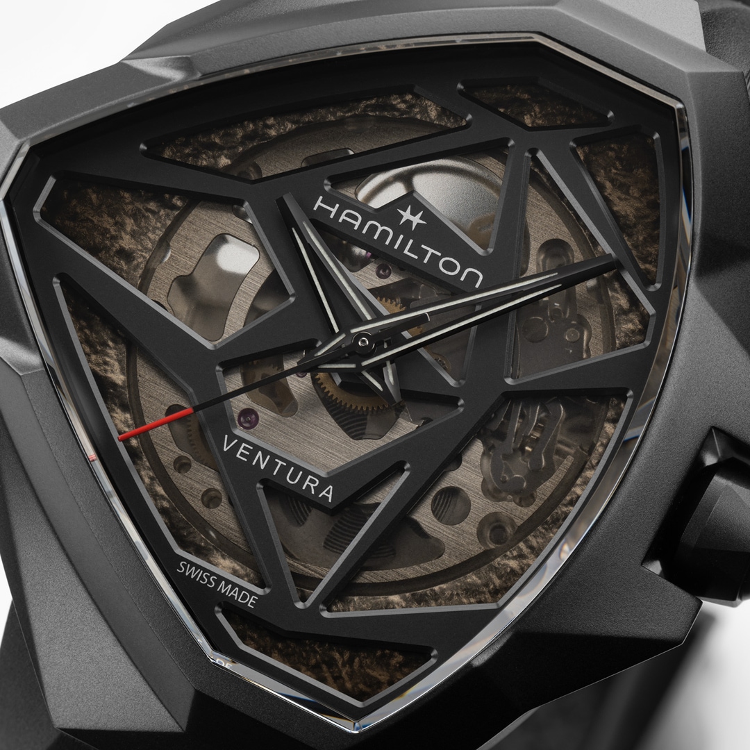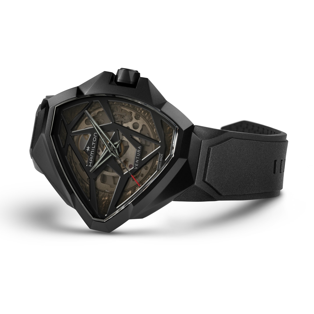 Défiant les conventions, la Ventura Edge Skeleton fait un bond dans le futur de l’horlogerie. S’éloignant de la structure emblématique du boîtier triangulaire Ventura, elle dévoile un nouveau design architectural audacieux. Sombre, énigmatique et radicale, cette montre joue avec l’ombre et la lumière pour apporter à sa silhouette une profondeur presque mystique. Le boîtier noir inédit abrite un mouvement H-10-S, subtilement révélé par un cadran squeletté dégradé. Cette montre est montée sur un bracelet en caoutchouc noir.