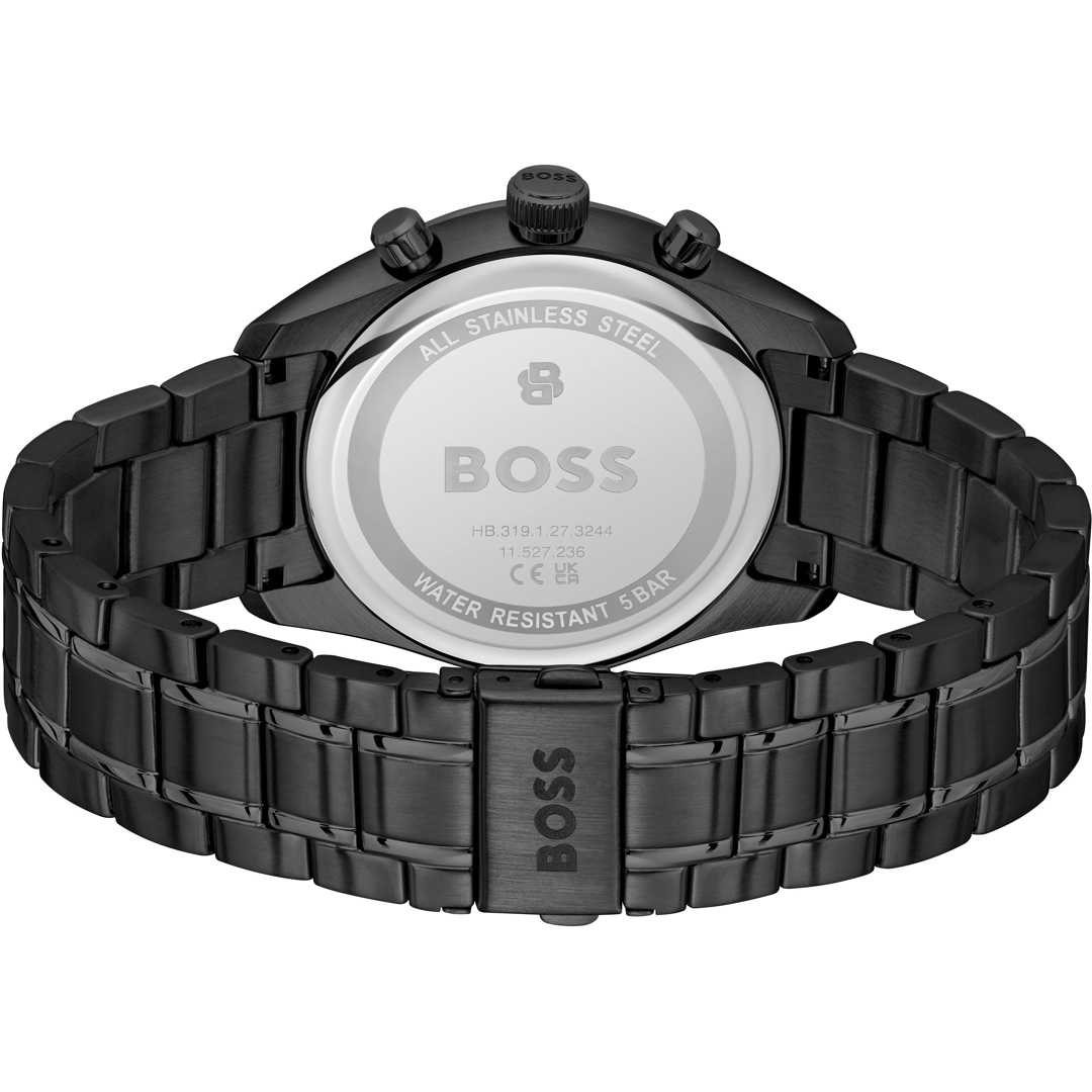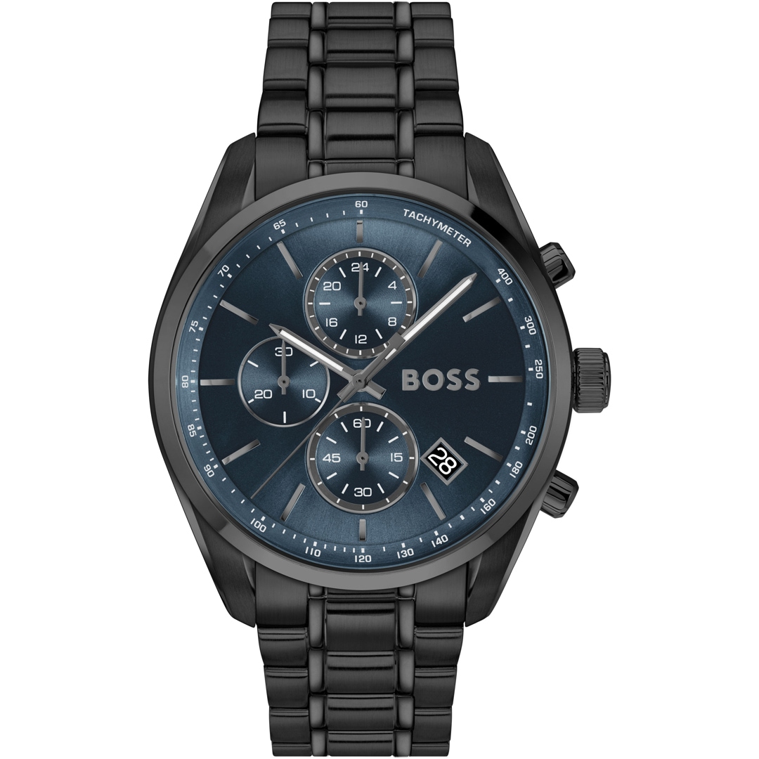 Le chronographe Boss est un hommage à la course automobile et est synonyme de performance, de précision et de grand confort. Les trois totalisateurs et le tachymètre permettent de mesurer le temps avec précision et d'estimer la vitesse. Le cadran est entouré d'un boîtier en acier inoxydable poli et brillant. Cette montre-bracelet pour hommes allie habilement un style sportif rétro-chic à une touche d'élégance.
