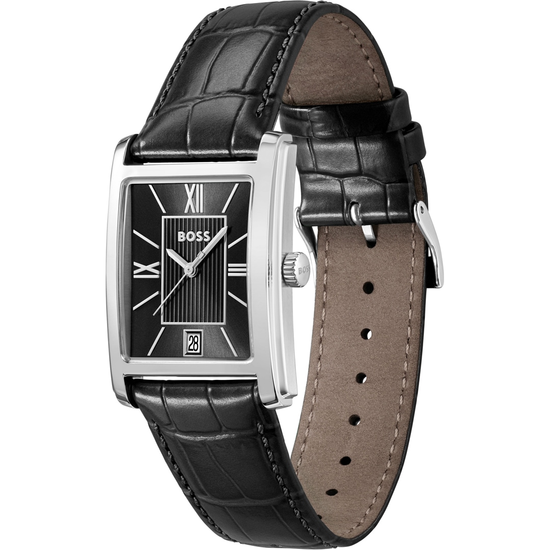 Montre Boss classique. Cet accessoire pour homme, doté d'un bracelet en cuir noir et d'une boucle caractéristique, est équipé d'un cadran épuré avec trois aiguilles et des chiffres discrets. Le boîtier en acier froid lui confère un look élégant au poignet.