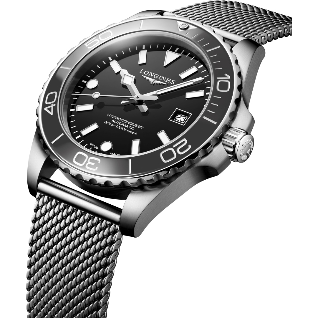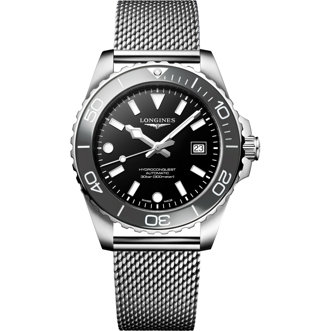 La collection HydroConquest allie esthétique moderne et performance éprouvée. Animée par un calibre automatique exclusif Longines, étanche jusqu'à 30 bar (300 m), avec lunette unidirectionnelle, couronne et fond vissés.