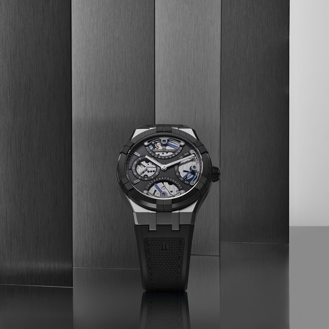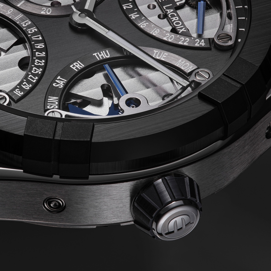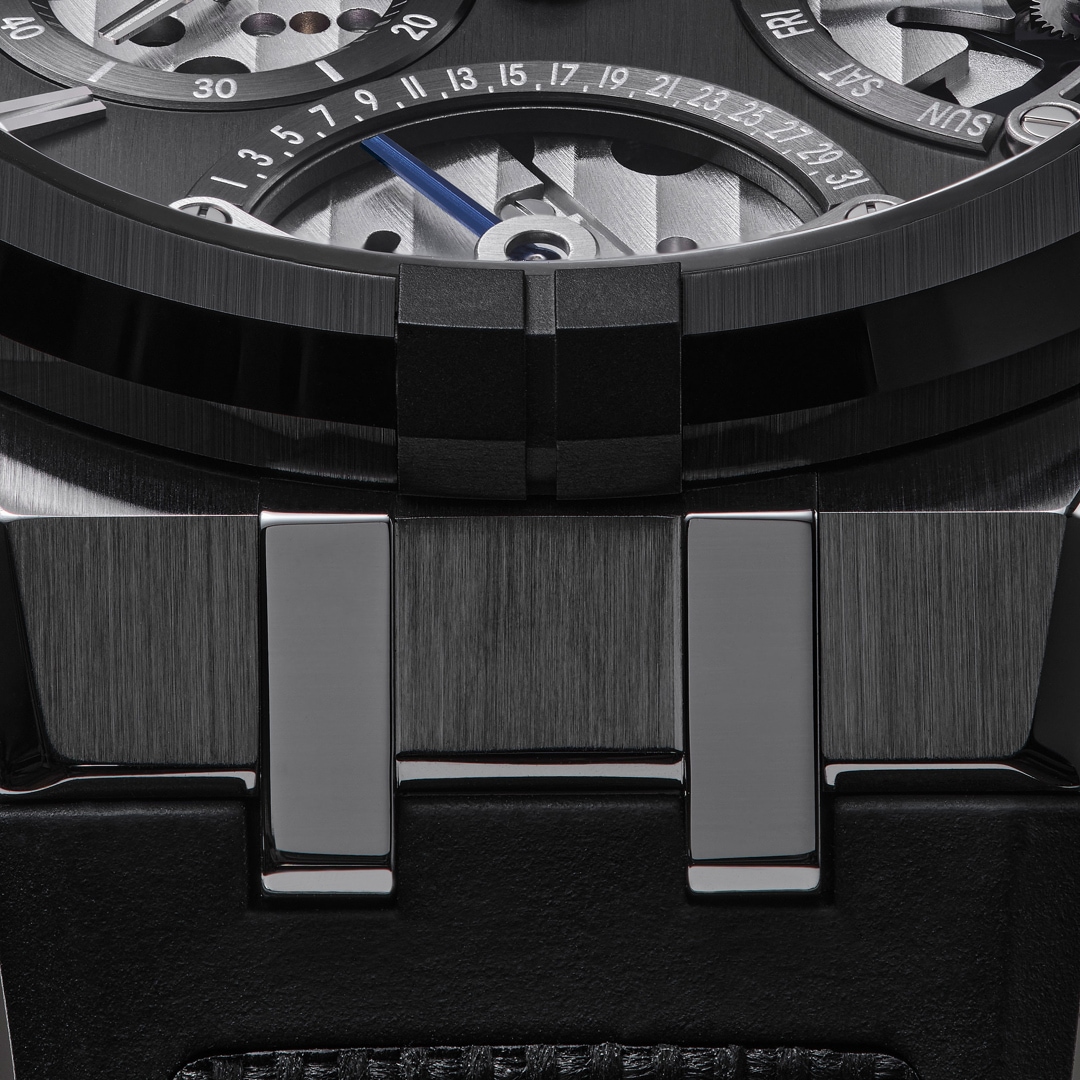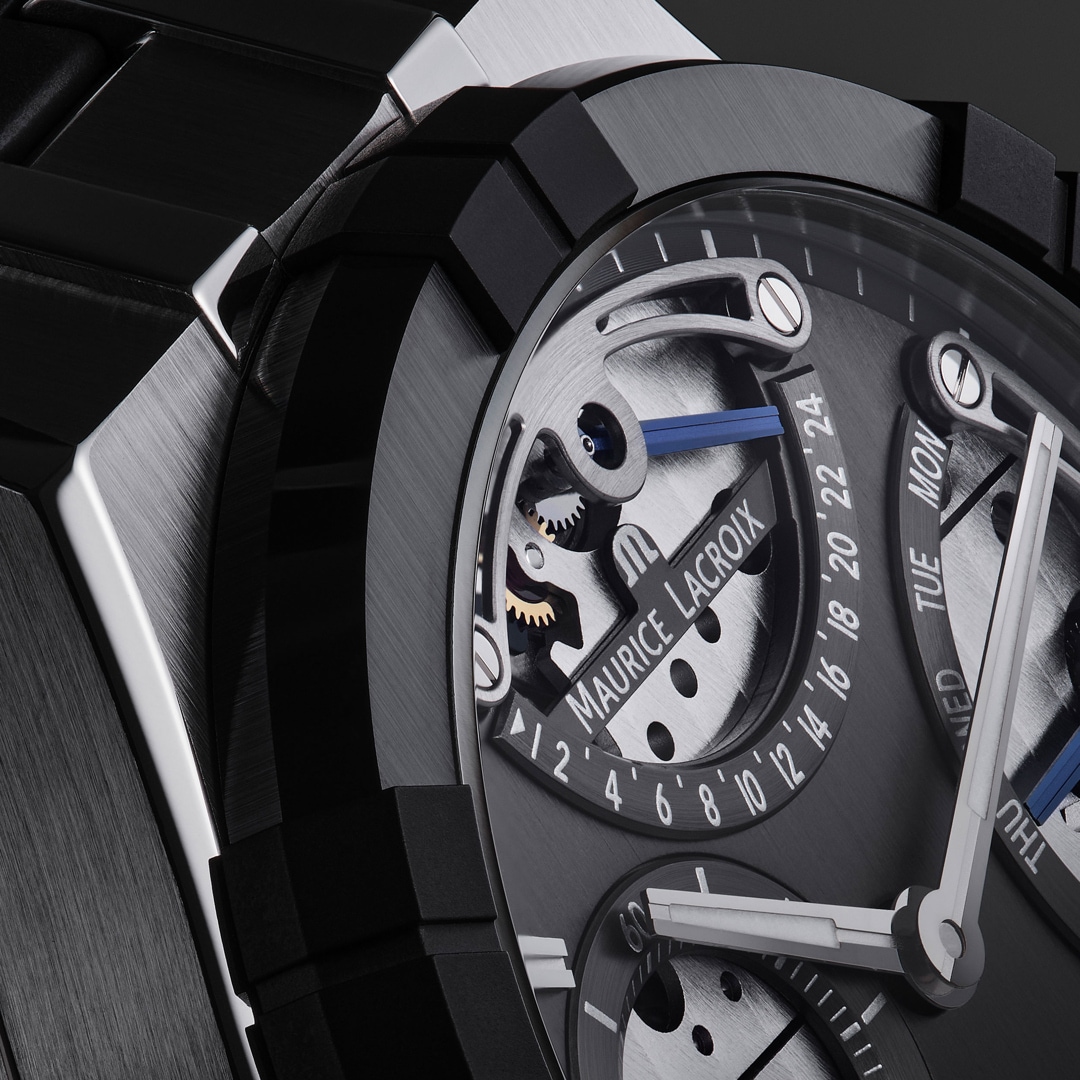 Admirez le spectacle captivant des aiguilles bleues de la date, du jour et de l'heure GMT glisser élégamment sur leurs arcs, avant de revenir à leur point de départ en un clin d'œil. Ce ballet technique se déploie sur un cadran anthracite brossé vertical, doté d'ouvertures squelettées révélant des aperçus du Calibre Manufacture ML291 rhodié.