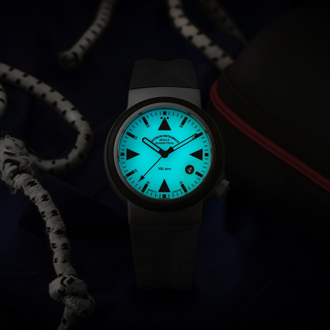 Transformez la nuit la plus profonde en plein jour. Avec cette version luminescente du célèbre S.A.R. Rescue Timer, Mühle Glashütte présente une montre opérationnelle conçue pour des conditions véritablement extrêmes. Le point d'orgue absolu de ce modèle est son cadran entièrement revêtu de matière luminescente. Sur celui-ci, les aiguilles laquées noir et délicatement squelettées se détachent de manière saisissante dans l'obscurité, vous offrant ainsi une lisibilité inégalée en tout temps. En outre, ce garde-temps sans compromis bénéficie de la robustesse éprouvée des véritables sauveteurs en mer. Un verre saphir étonnamment massif de quatre millimètres d'épaisseur et l'emblématique lunette en caoutchouc souple résistent sans effort à une pression d'eau colossale de 100 bars. Découvrez une fiabilité mécanique exceptionnelle alliée à une résistance maximale grâce au système de régulation à col de pic vert propre à la manufacture.