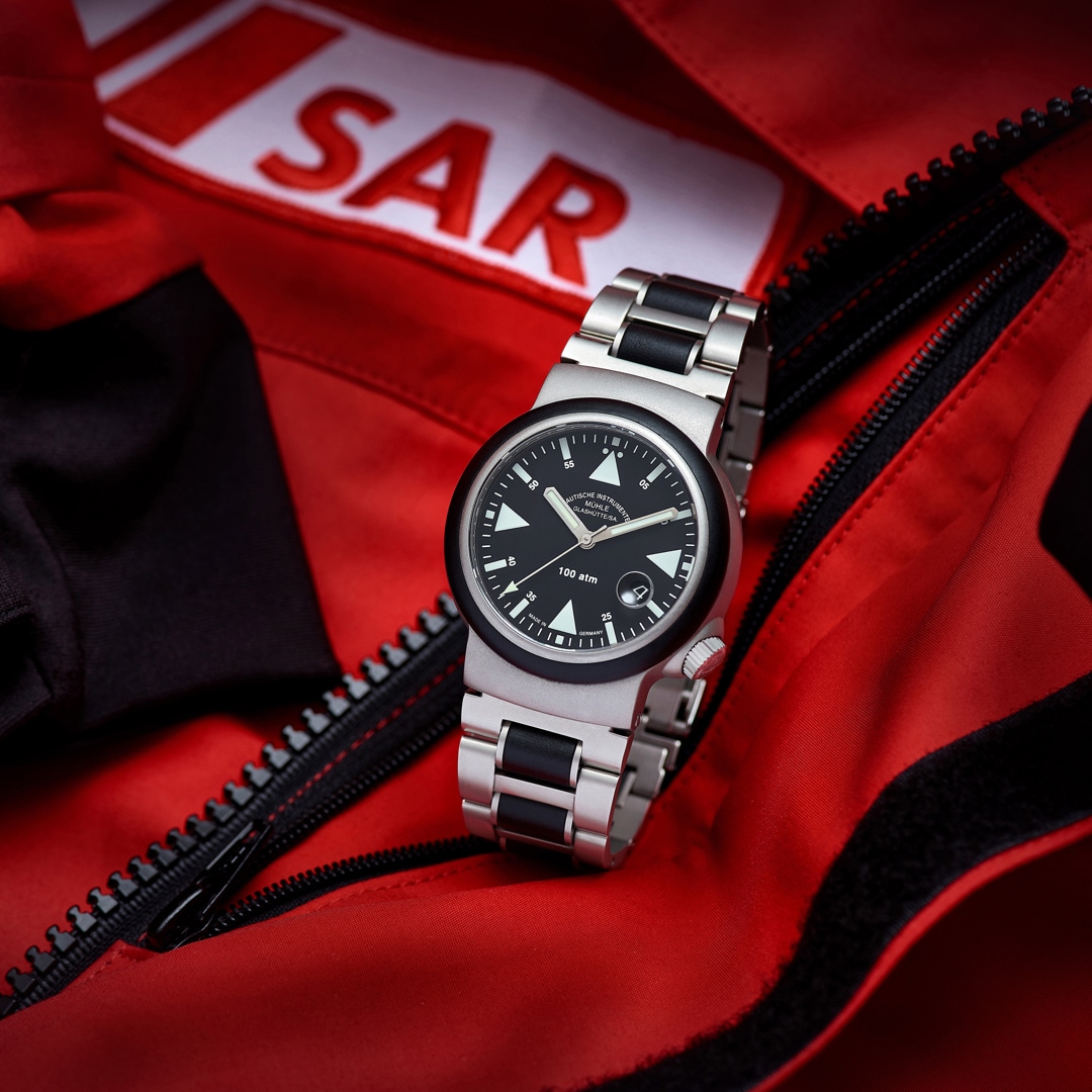 Lorsque chaque seconde compte et que les éléments se déchaînent, vous avez besoin d'une montre qui n'abandonne jamais. C'est précisément pour ces interventions extrêmes que le S.A.R. Rescue Timer de Mühle Glashütte a été créé, en collaboration directe avec les courageux capitaines des sauveteurs en mer. Afin d'éviter toute blessure en cas d'urgence, une lunette en caoutchouc souple et amortissante enveloppe le boîtier spécialement arrondi pour le protéger. Un verre saphir d'une robustesse incroyable de quatre millimètres d'épaisseur protège le mécanisme et résiste sans effort à une pression d'eau colossale allant jusqu'à 100 bars. Le cadran épuré, doté d'une loupe de date ingénieusement meulée dans la face interne du verre, vous offre la meilleure lisibilité possible quelles que soient les conditions météorologiques. Faites une confiance absolue à un véritable instrument opérationnel nautique, dont le mouvement automatique de précision maîtrise souverainement les chocs les plus violents grâce au système de régulation à col de pic vert.