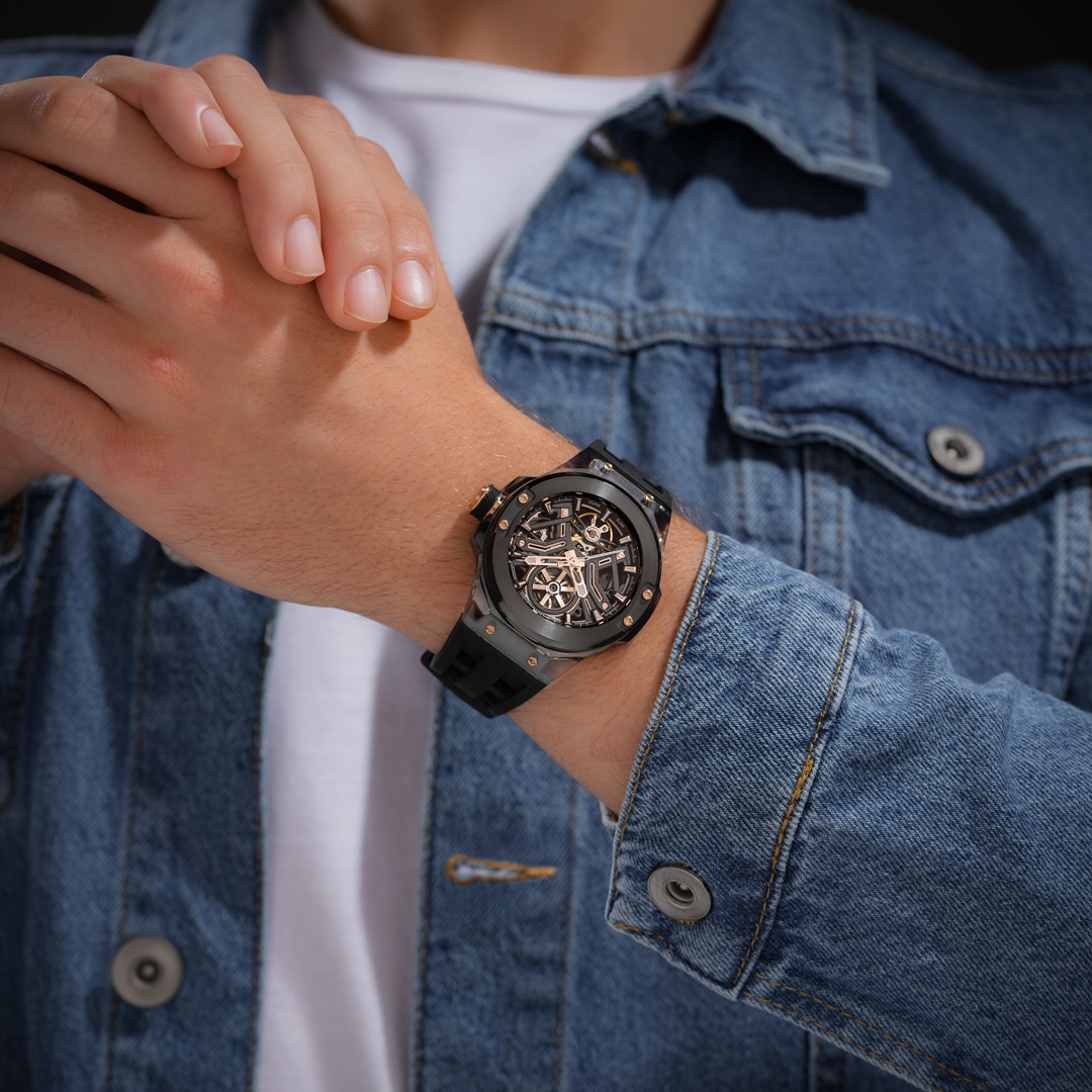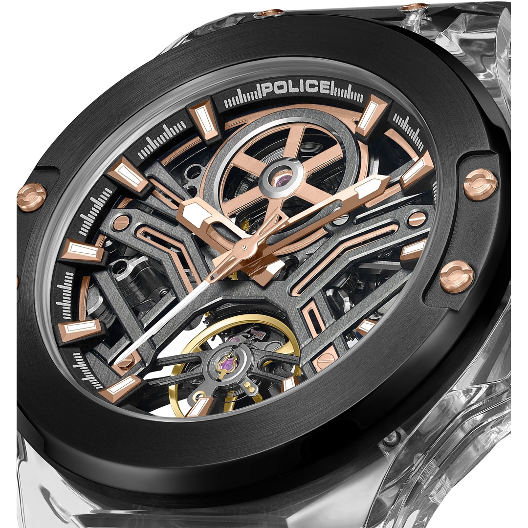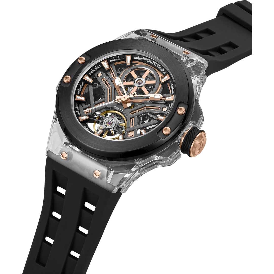 La Cyclone brise les règles – un rebelle automatique qui refuse de passer inaperçu. Le boîtier transparent noir, aux finitions polies et satinées, se complète d’une lunette noire ionisée avec détails vissés, apportant un style mécanique brut. Au cœur de la montre, un cadran superposé brossé gun laisse entrevoir le mouvement interne, contrasté par des index en or rose et un rehaut noir. L’acier enveloppé de silicone noir reflète la construction audacieuse et se combine avec un robuste bracelet en silicone.