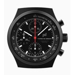 Fabriqué dans la propre manufacture horlogère de Porsche Design, ce garde-temps rend hommage au design unique et épuré du chronographe entièrement noir de 1972. À l'instar de son modèle révolutionnaire, le chronographe se distingue par un cadran noir mat. La couronne et le fermoir sont tous deux ornés du logo Porsche Design actuel, ce qui confère au design global une note marquante.