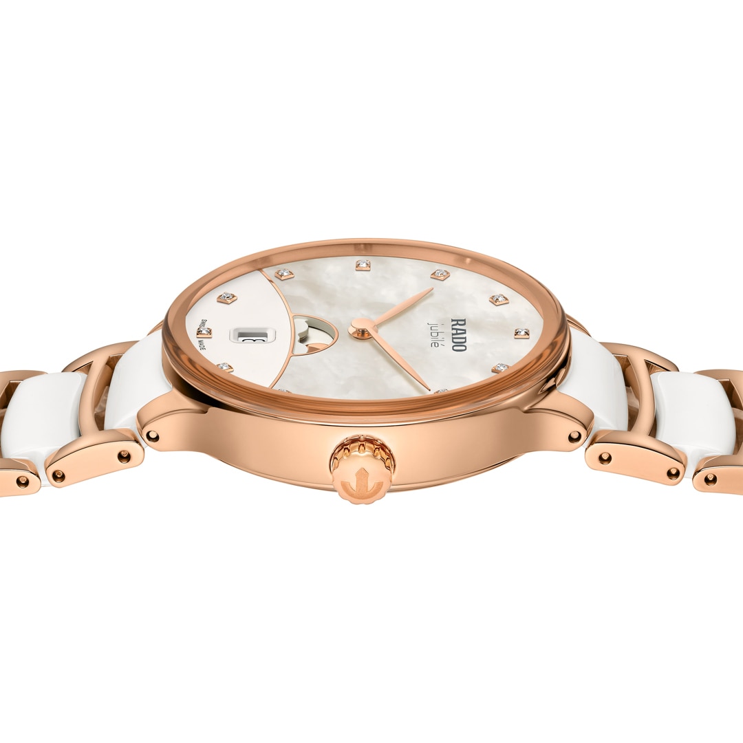 Découvrez l'alliance harmonieuse de l'élégance intemporelle et de la précision cosmique avec la Rado Centrix Moonphase. Inspiré par l'immensité infinie du ciel étoilé, ce garde-temps conjugue des matériaux luxueux à un savoir-faire horloger d'exception. Son cadran en nacre délicate, évoquant un ciel voilé de nuages, scintille de l'éclat incomparable de diamants précieux.
