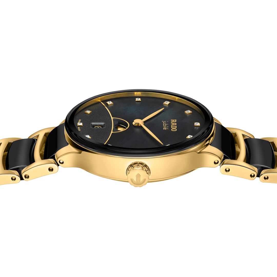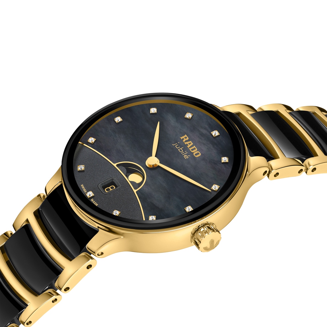 Découvrez l'alliance harmonieuse de l'élégance intemporelle et de la précision cosmique avec la Rado Centrix Moonphase. Inspiré par l'immensité infinie du ciel étoilé, ce garde-temps conjugue des matériaux luxueux à un savoir-faire horloger d'exception. Son cadran en nacre délicate, évoquant un ciel voilé de nuages, scintille de l'éclat incomparable de diamants précieux.