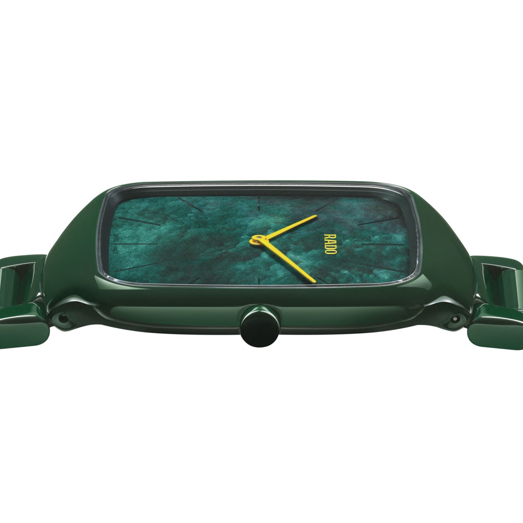 Découvrez le mélange harmonieux d’expression artistique et de précision suisse avec la Rado True Square Thinline. Ce modèle est animé par un mouvement à quartz Rado calibre R420 fiable pour un fonctionnement précis tout en élégance naturelle. La taille du boîtier de 37 mm forme un équilibre parfait entre style et confort, convenant ainsi à toutes les occasions. Le boîtier et la couronne en céramique haute technologie verte polie affiche une esthétique audacieuse et contemporaine, à l’image du design moderne. Avec sa construction monobloc et son verre saphir plat, cette montre est synonyme de durabilité et d’élégance intemporelle. Le cadran est en nacre verte avec des aiguilles laquées jaunes et le logo Rado imprimé en jaune. Créé avec précision, le bracelet en céramique haute technologie verte polie vient compléter le boîtier dans un style fluide et homogène.