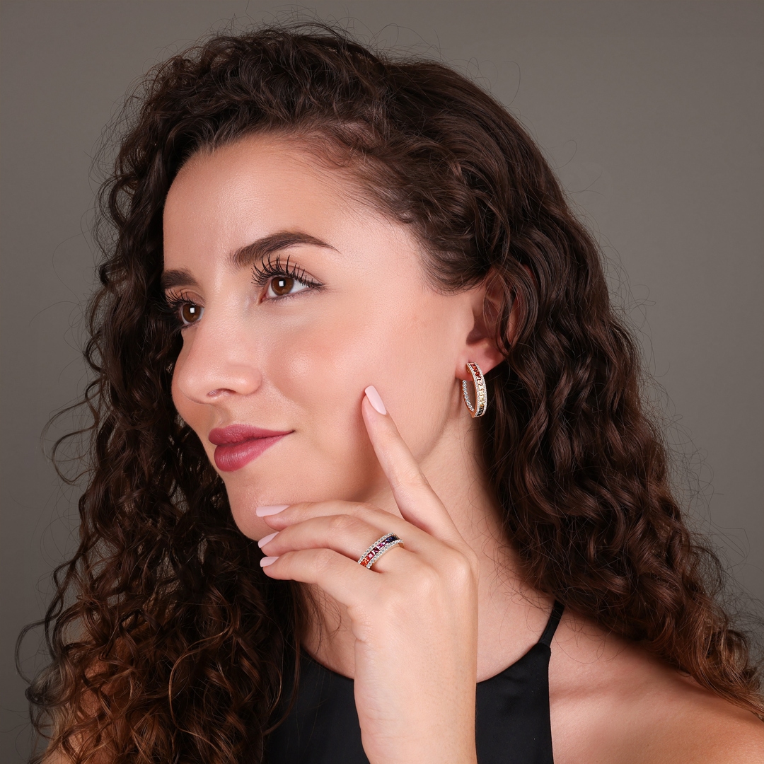 Plongez dans l'univers coloré avec ces ravissantes créoles Rainbow en or rosé 18 carats. Chaque créole est habilement sertie de 13 saphirs chauffés de taille princesse, chacun offrant une couleur unique. Rassemblés, ces saphirs créent un effet arc-en-ciel captivant qui attire le regard et égaye l'esprit. Les saphirs sont encadrés par un total de 72 diamants taille brillant, dont l'éclat souligne la beauté des pierres. Ces créoles vont au-delà du simple bijou : elles expriment le style et la joie de vivre, idéales pour ceux qui apprécient la couleur et le raffinement.