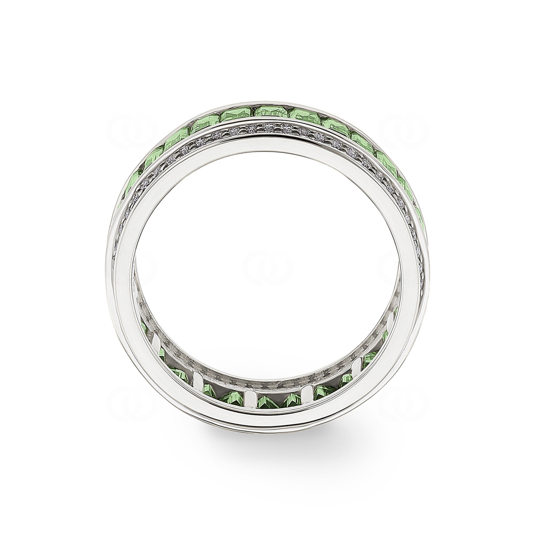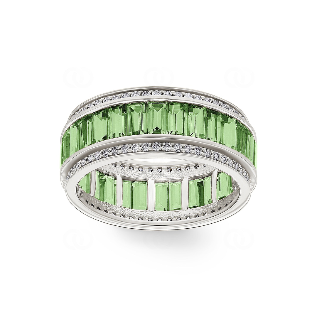 Cette bague en or gris 18 carats est un fascinant jeu de couleur et de lumière, conçue pour les amateurs de designs exceptionnels. Au centre, une rangée continue de 30 péridots taille baguette attire tous les regards. Leur éclat vert frais et lumineux est brillamment encadré de chaque côté par une rangée de diamants étincelants. Au total, 108 diamants apportent un contraste intense et font ressortir encore davantage la couleur des pierres vertes. Le sertissage qui entoure entièrement la bague garantit une beauté parfaite sous tous les angles.