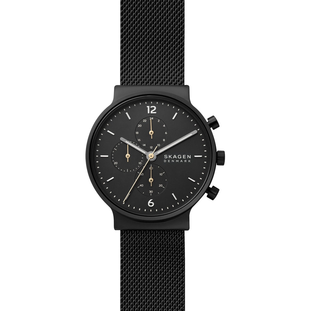 Cette montre Ancher de 40 mm est dotée d’un boîtier en acier inoxydable, d’un cadran effet sablé noir, d’un mouvement chronographe et d’un bracelet en maille milanaise inoxydable noir. Pour ce modèle, le bracelet de la montre est interchangeable.