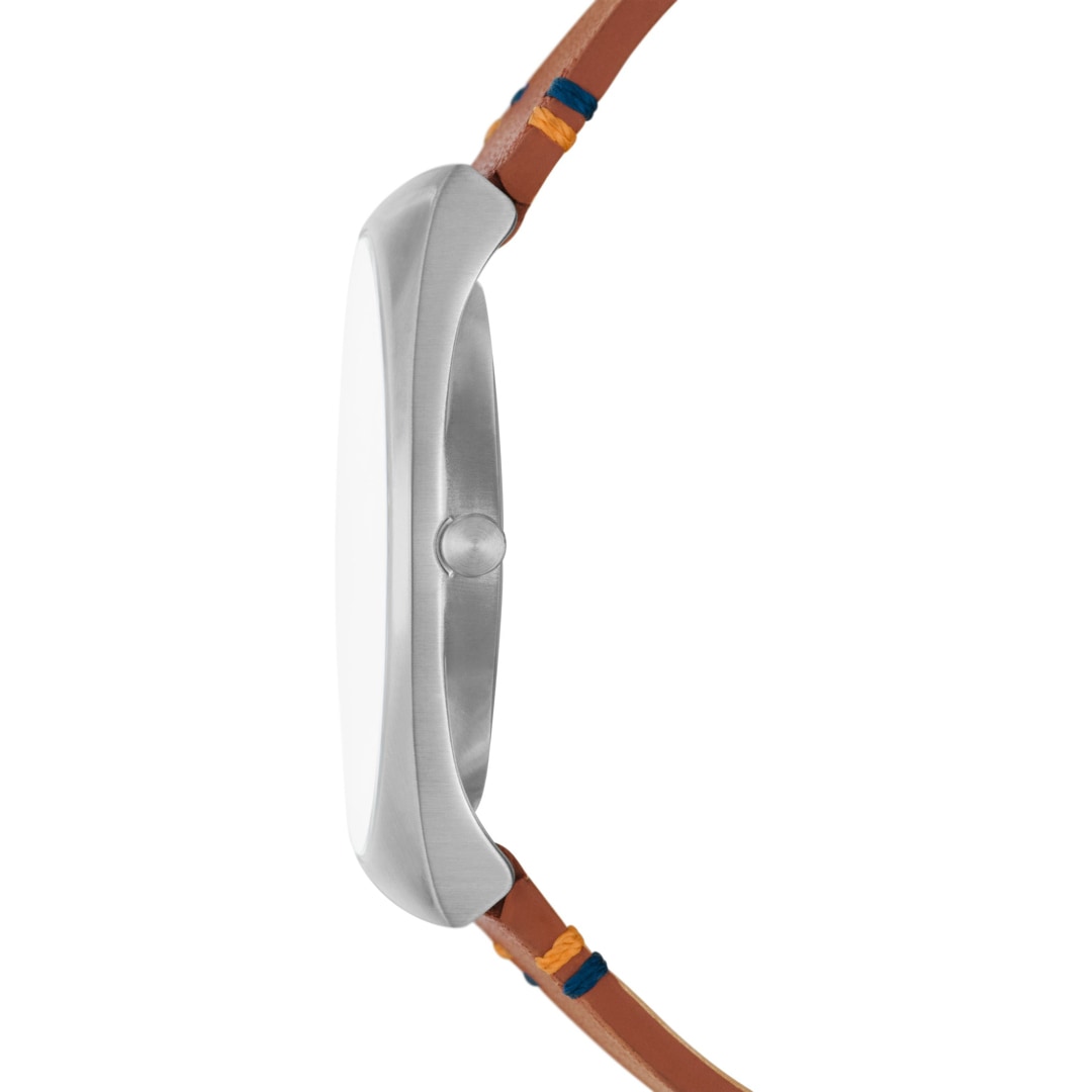 La silhouette de la montre pour hommes Grenen Solar Disc rappelle de manière fonctionnelle et minimaliste la ligne côtière de la plage de Grenen à Skagen, au Danemark. Cette montre pour hommes de 37 mm avec un mouvement solaire et un boîtier argenté en acier inoxydable recyclé à au moins 50 % a un cadran blanc mat. Elle est livrée avec un bracelet en cuir marron clair.