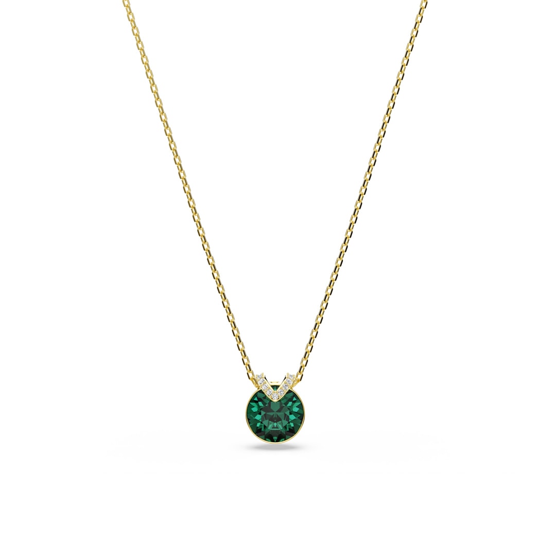 Ce pendentif fascinant en forme de V attire tous les regards grâce à son cristal vert central serti dans un placage de ton or. Un pavé scintillant ajoute une touche supplémentaire de beauté, tandis que la chaîne délicate respire l’élégance pure.