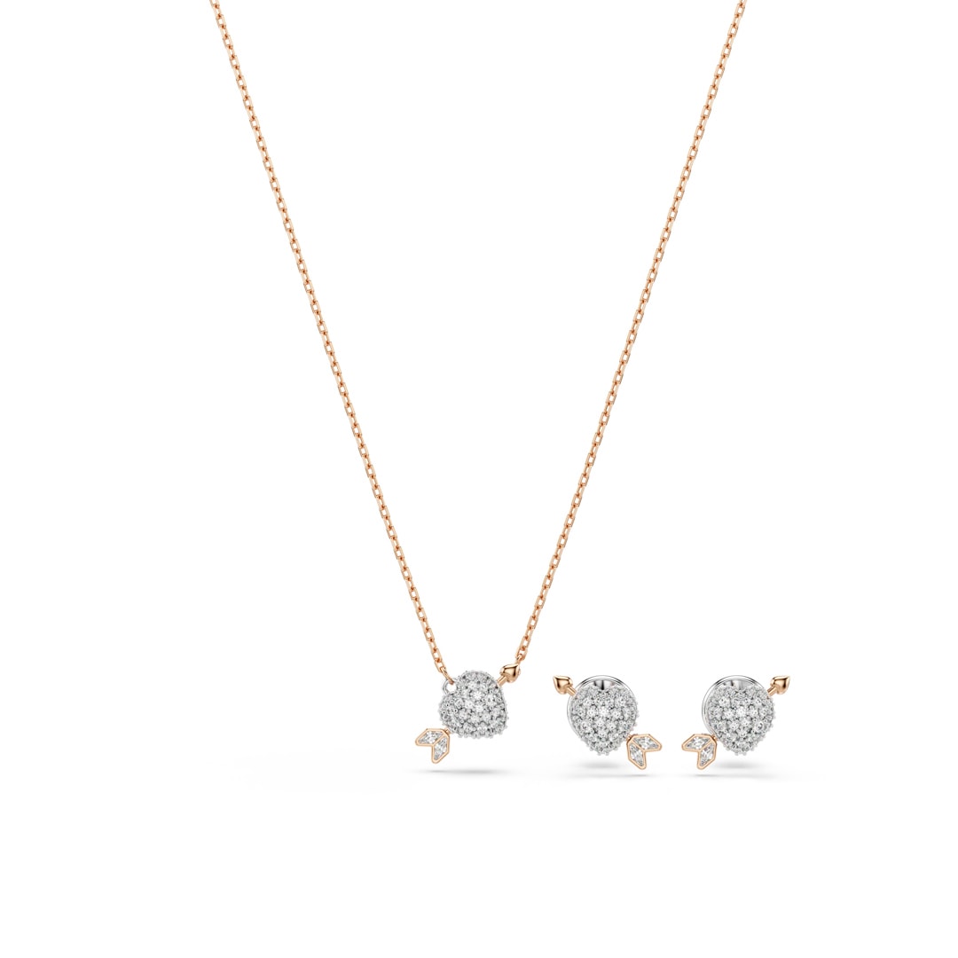 Faites vibrer la passion dans votre style avec cette parure comprenant un pendentif et des boucles d’oreilles étincelants. Chaque cœur en métal rhodié est orné de cristaux incolores et transpercé par la flèche de Cupidon au placage de ton or rose. Une combinaison unique pour les jours où l’amour mérite de briller.