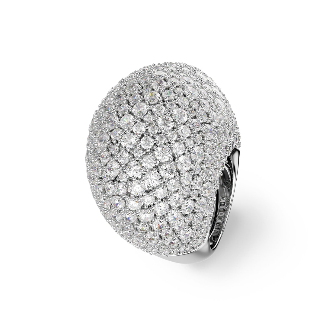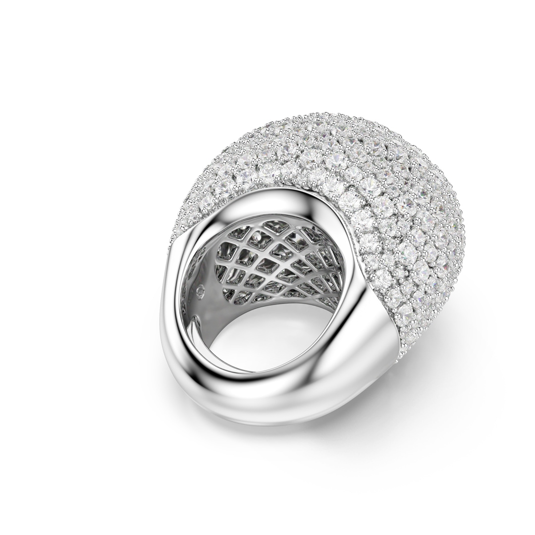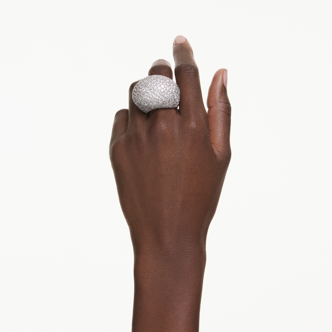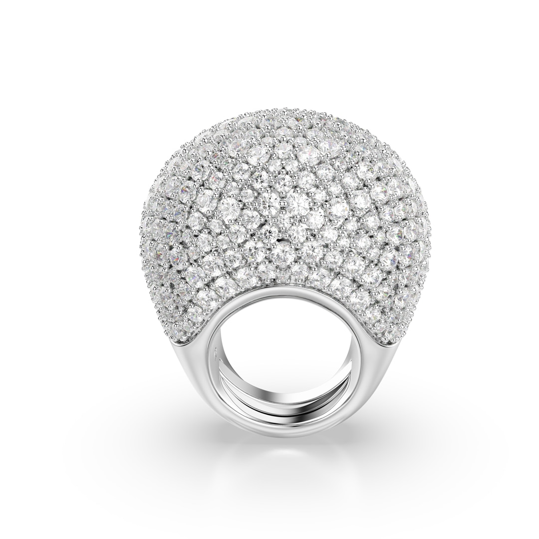 Cette bague cocktail bombée est l’essence même d’une joyeuse ’extravagance. Son design scintillant en métal rhodié présente une superbe décoration de Swarovski Zirconia incolores, sertis selon la technique du chatonnage. Pour plus de confort, la bague est conçue avec un mécanisme ajustable.