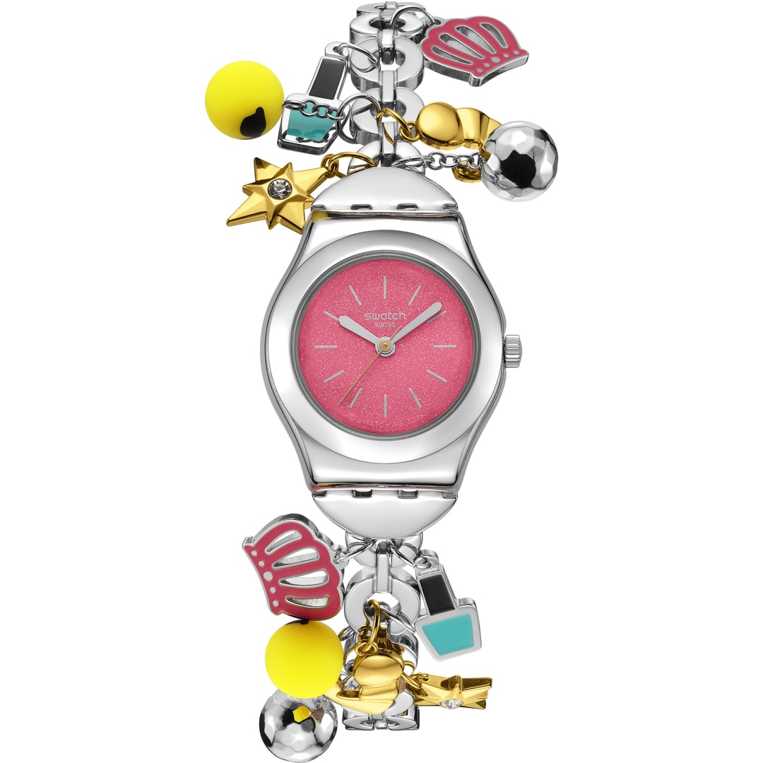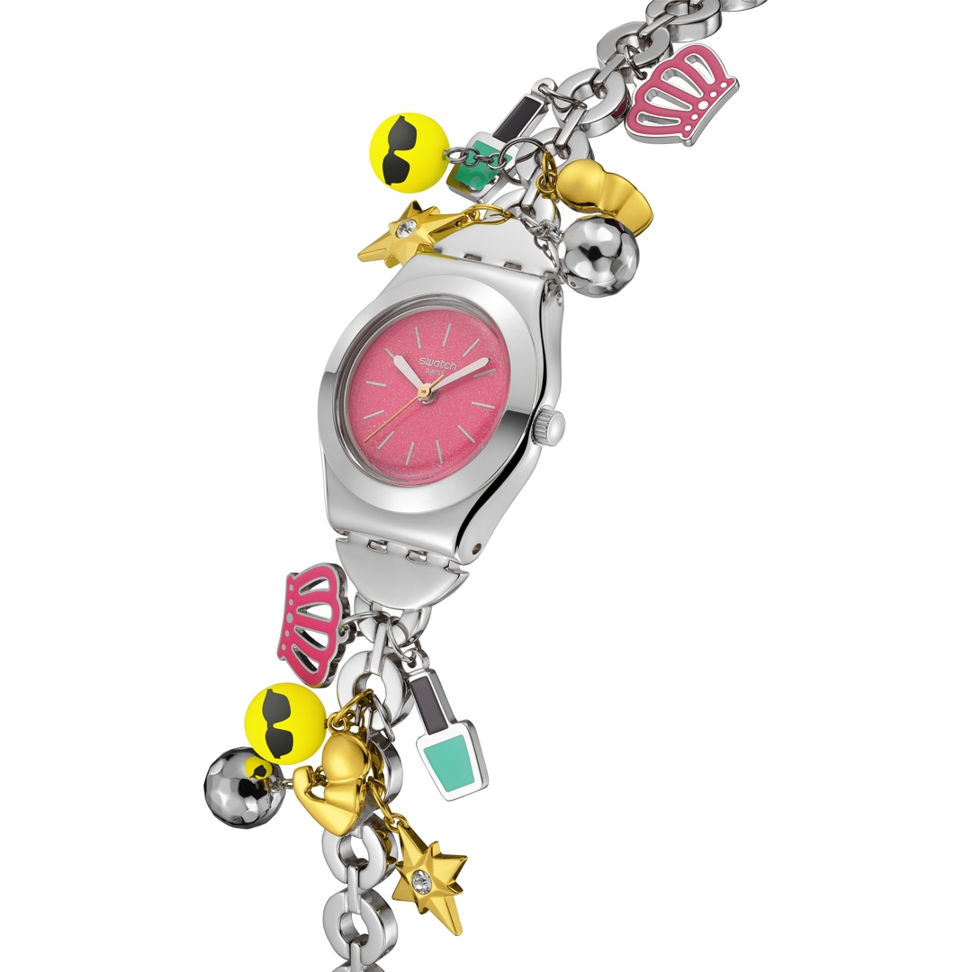 Cette montre spéciale Fête des mères présente un cadran rose à l'effet irisé et des index imprimés argentés. Ses aiguilles argentées et sa trotteuse dorée donnent l’heure dans un boîtier en acier inoxydable poli. Son bracelet en acier inoxydable poli est orné de plusieurs charmes assortis : vernis, couronnes, smileys avec lunettes de soleil, étoiles, biceps contractés et boules à facettes.