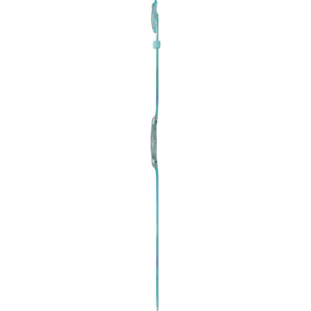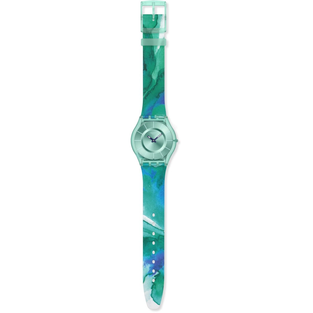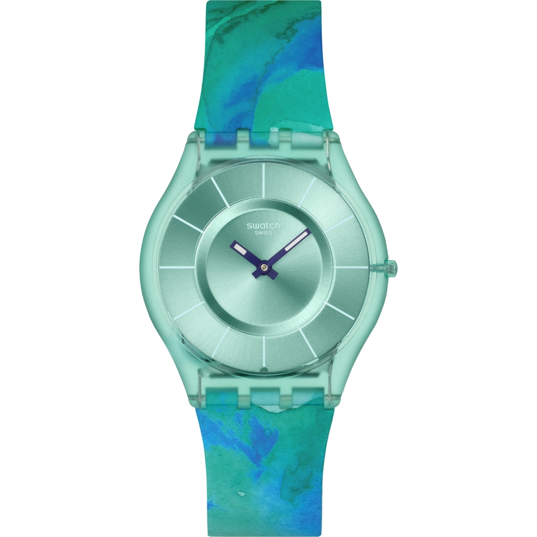 Cette montre ultra-fine et ultra-légère possède un cadran turquoise à effet brossé soleil, des index imprimés turquoise clair et des aiguilles bleues qui brillent dans l'obscurité, le tout protégé par un verre biosourcé. Le boîtier biosourcé transparent turquoise mat s'associe à un bracelet transparent turquoise mat à motif multicolore, avec une boucle et un passant assortis.