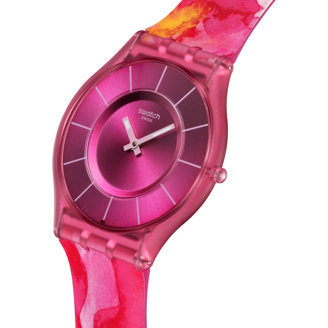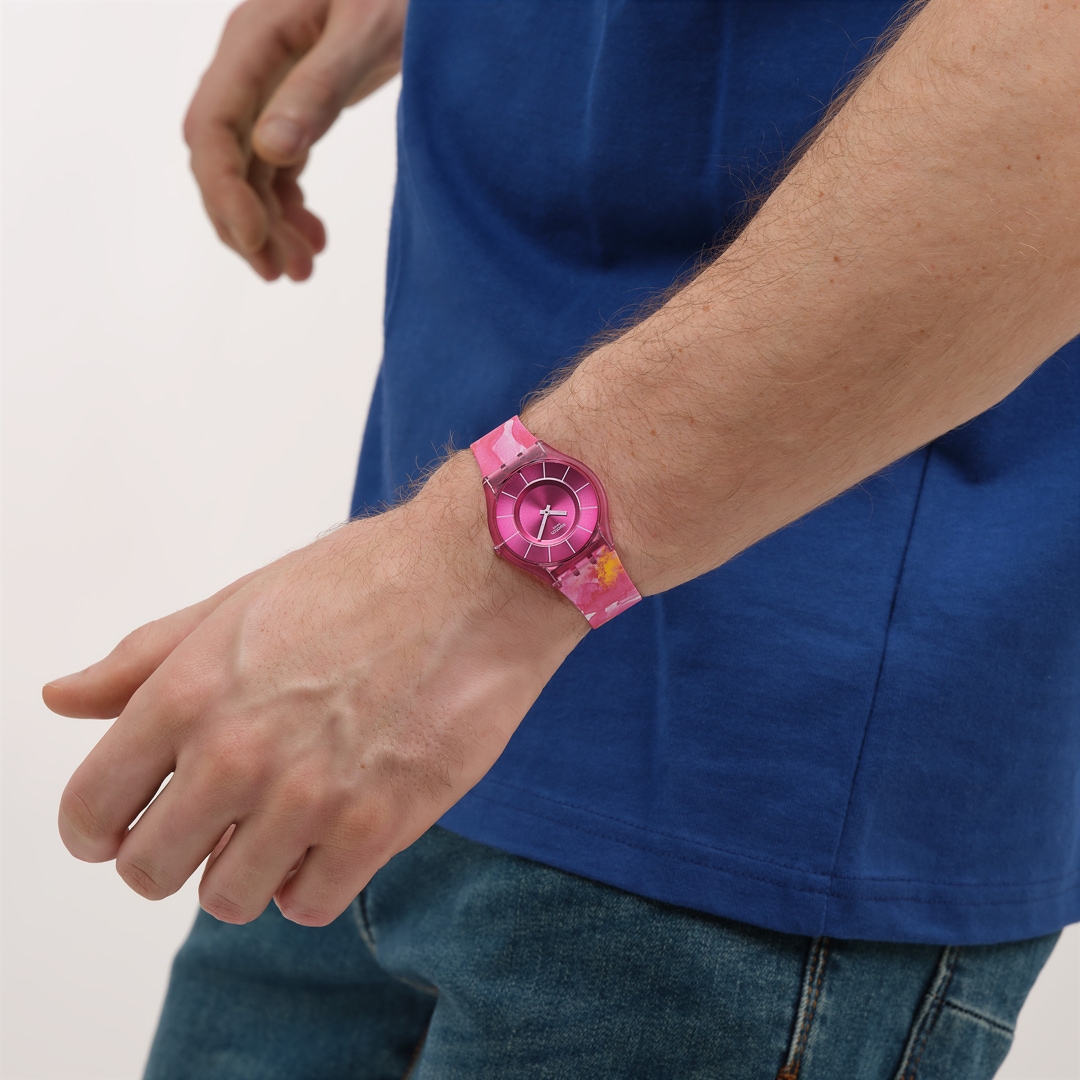 Cette montre ultra-fine et ultra-légère possède un cadran rose à effet brossé soleil, des index et des aiguilles rose clair qui brillent dans l'obscurité, le tout protégé par un verre biosourcé. Le boîtier biosourcé rose mat transparent s'associe à un bracelet rose mat transparent à motif multicolore, avec une boucle et un passant coordonnés.