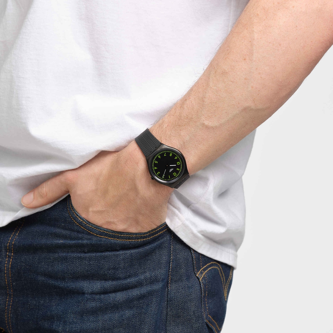 Le cadran noir de cette montre SKIN IRONY 42 vole la vedette avec des chiffres imprimés verts, des aiguilles noires qui brillent dans l’obscurité et un verre minéral. Cette montre noire a un bracelet en caoutchouc texturé sur la face avec un passant vert, plus une boucle à ardillon et un boîtier en PVD noir brossé.
