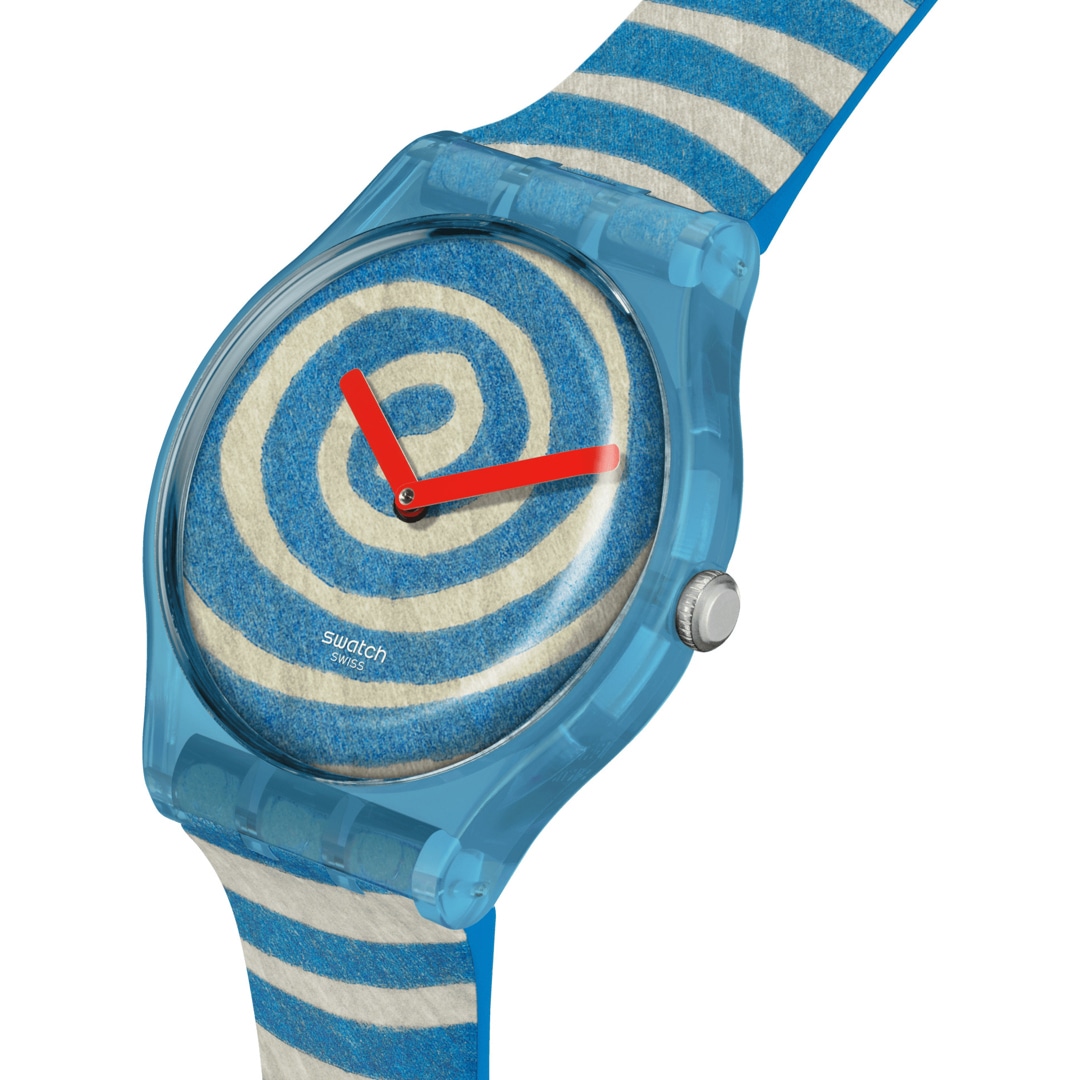 Cette montre de la collection Swatch x Tate Gallery a un boîtier transparent bleu mat. SPIRALS, œuvre de Louise Bourgeois, est imprimée sur le cadran et le bracelet bleu mat de cette montre. Des aiguilles des heures et des minutes rouges indiquent l’heure. Le logo de la Tate Gallery est imprimé sur le passant transparent mat. Louise Bourgeois SPIRALS 2005 (detail) Suite of 12 woodcuts on Japanese handmade paper. © The Easton Foundation / DACS, London 2024. Photo: Christopher Burke / © Tate