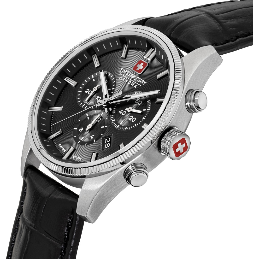La Swiss Military Hanowa Airman se présente dans une robe raffinée et noble, séduit par sa précision, sa robustesse et est étanche jusqu'à une pression de 10 bar (100 m). Le bracelet de qualité supérieure en cuir de veau assure un grand confort au porter. Signe particulier de la qualité Swiss Made, le chronographe porte l'emblème suisse sur le cadran et la couronne protégés par un verre saphir.