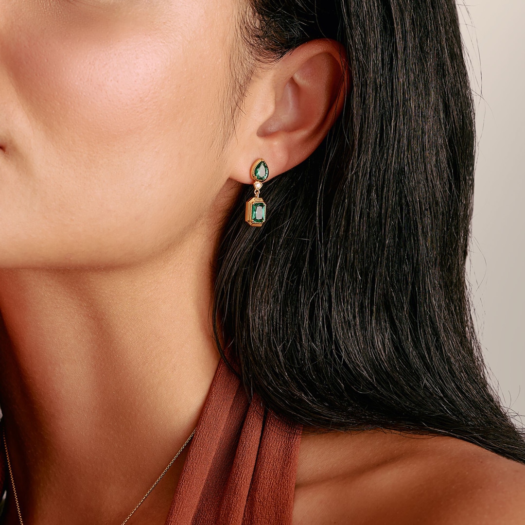 Subtiles mais présentes : une pierre goutte vert émeraude attire le regard vers une pierre octogone au même ton, tandis qu’un petit zirconia rond apporte une note de mouvement. L’alternance de formes nettes et de tailles raffinées confère à ces boucles Elyndra une élégance moderne et une aura féminine—idéales pour des looks quotidiens stylés ou des instants particuliers.