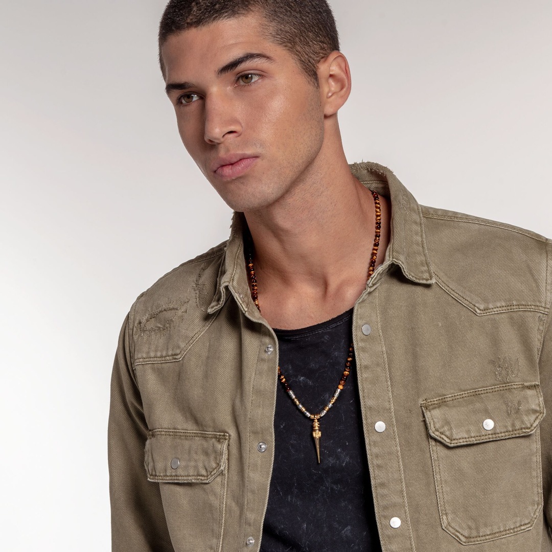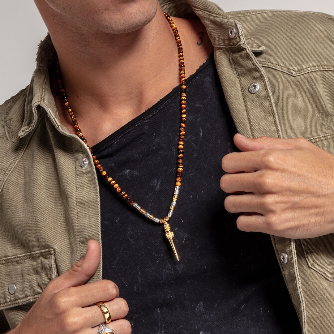 Pour les baroudeurs : inspiré des colliers malas de méditation, ce bijou en perles d'œil-de-tigre amaties et polies agrémenté d'éléments en argent iconique évoque la protection et la méditation. Le détail fantaisie du collier est un pendentif chargé de signification à l'effigie du « Phurpa », cette dague magique traditionnelle de la région de l'Himalaya qui symbolise le centre du monde. Le fermoir macramé permet d'ajuster individuellement la longueur.