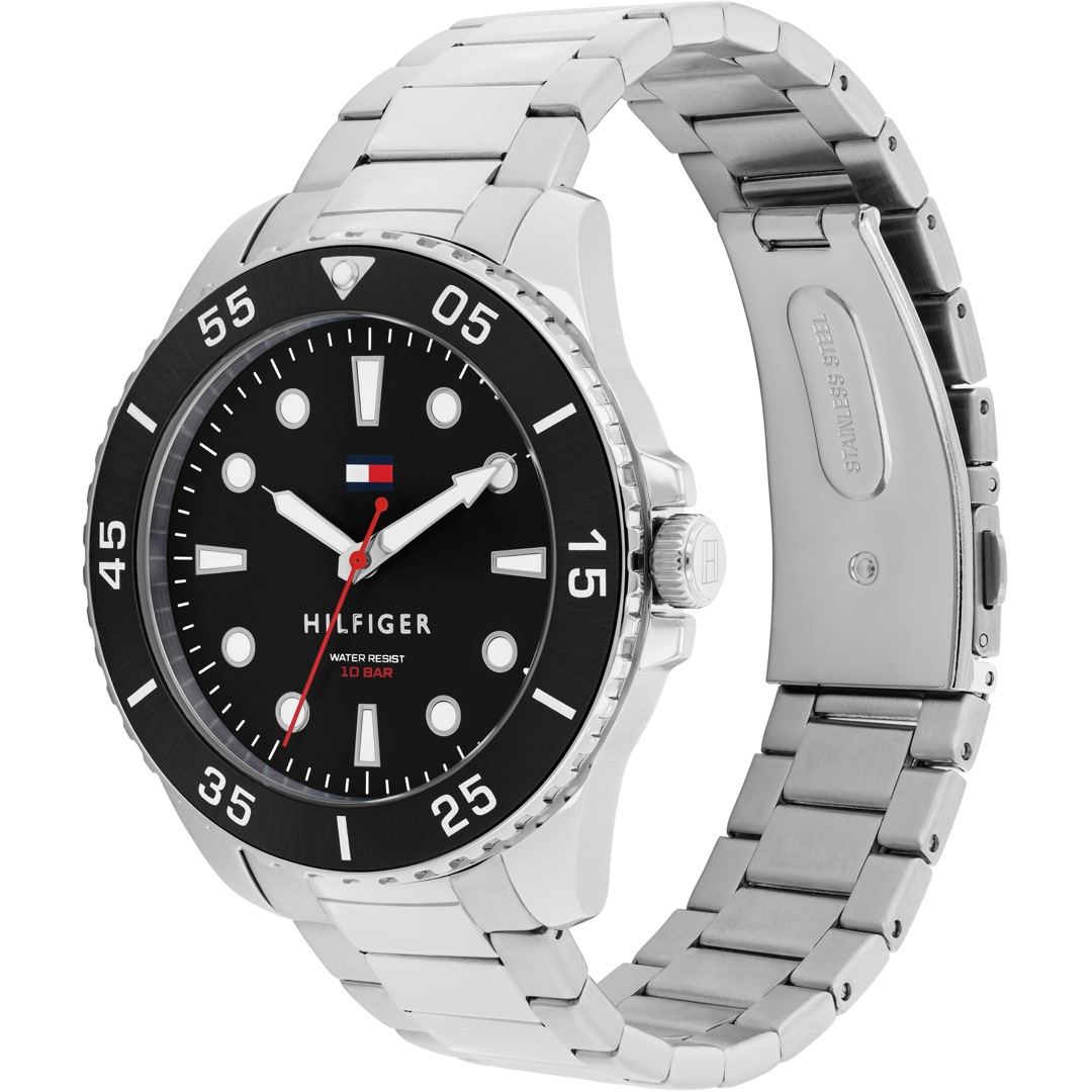 Montre de sport Tommy Hilifger fabriquée avec précision et dotée d'une lunette de plongée. Cet accessoire masculin épuré de style plongeur est fabriqué en acier inoxydable robuste pour un look masculin. Un bracelet en acier inoxydable avec le logo Tommy gravé complète le style. Grâce aux aiguilles luminescentes des heures et des minutes, l'heure est bien lisible même dans des conditions de faible luminosité.