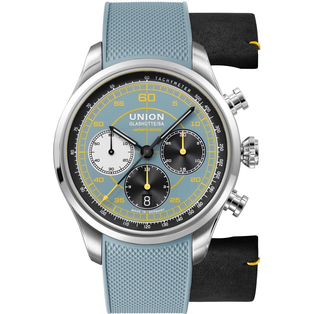 Le nouveau Belisar Chronograph Limited Edition Speedster 2025 s'inspire d'une rare voiture de rallye italienne des années 1980 – une automobile originale synonyme de performance, de style et d'innovation technique. La combinaison du gris-bleu mat et du jaune vif confère à la montre une apparence à la fois moderne, sportive et élégante. Le choix des couleurs, délibérément inhabituel, représente le dynamisme et l'individualité. Des chiffres arabes jaunes, un réticule central et l'échelle tachymétrique soulignent le caractère « racing » du modèle. Les aiguilles bénéficient d'une finition PVD noir, créant un contraste saisissant. Plutôt qu'une numérotation traditionnelle, le cadran affiche les intervalles de secondes – une référence subtile à l'inspiration stylistique de la montre. Le bracelet en caoutchouc texturé gris-bleu fait écho à la couleur du cadran, sa texture rappelant les surfaces des tableaux de bord italiens. Le modèle est complété par un bracelet interchangeable en cuir, offrant ainsi à son propriétaire des options de style supplémentaires.