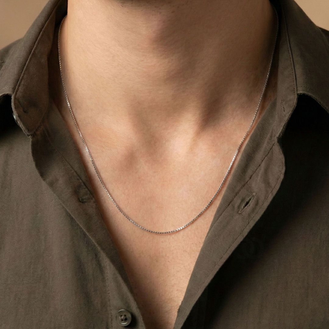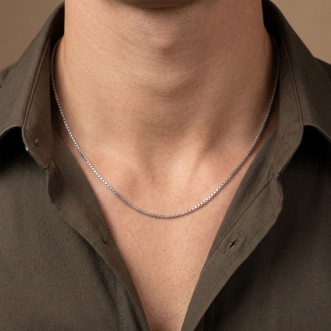 La chaîne vénitienne tire son nom de son origine italienne. La particularité de cette chaîne réside dans la forme des maillons et leur disposition. Dans ce bijou, les maillons sont disposés de manière rectangulaire avec des parois latérales relativement hautes. Ces maillons sont ensuite reliés entre eux comme n'importe quelle autre chaîne. Lorsque la chaîne commence à bouger, les éléments carrés s'imbriquent les uns dans les autres, conférant à ce type de chaîne une apparence très attrayante et élégante. Cette chaîne vénitienne en or gris 18 carats d'une largeur de 1,1 mm possède une surface diamantée. Elle se ferme facilement et en toute sécurité grâce à un fermoir mousqueton. La fine chaîne est discrète et se combine de multiples façons. Elle peut être portée aussi bien avec une tenue décontractée qu'avec une tenue de soirée élégante.