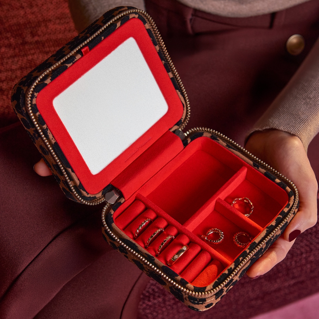 Voyagez en toute confiance. Compact mais brillamment organisé, l'étui à bijoux Savanna se glisse sans effort dans n'importe quel sac, tout en gardant vos bijoux impeccablement rangés et protégés. L'imprimé léopard apporte une touche d'audace, tandis que l'intérieur rouge signature LusterLoc™ offre une protection ultime.