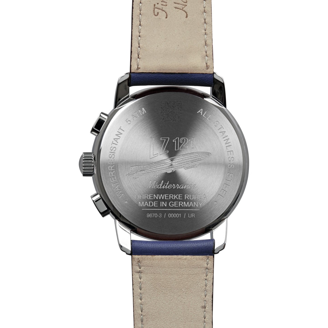 Laissez la Zeppelin Méditerranée vous transporter dans l'âge d'or des années vingt. Son cadran bleu rayonnant capture le charme du Sud et s'harmonise à merveille avec les fins détails beiges. Animé par un mouvement chronographe à quartz précis Citizen Miyota 6S21, ce modèle offre une fiabilité absolue. Le verre de sécurité K1 bombé protège l'esthétique raffinée des rayures au quotidien. Fabriqué dans la propre manufacture à Ruhla, ce modèle incarne la promesse de qualité « Made in Germany » et confère à chaque tenue une note d'élégance cosmopolite.