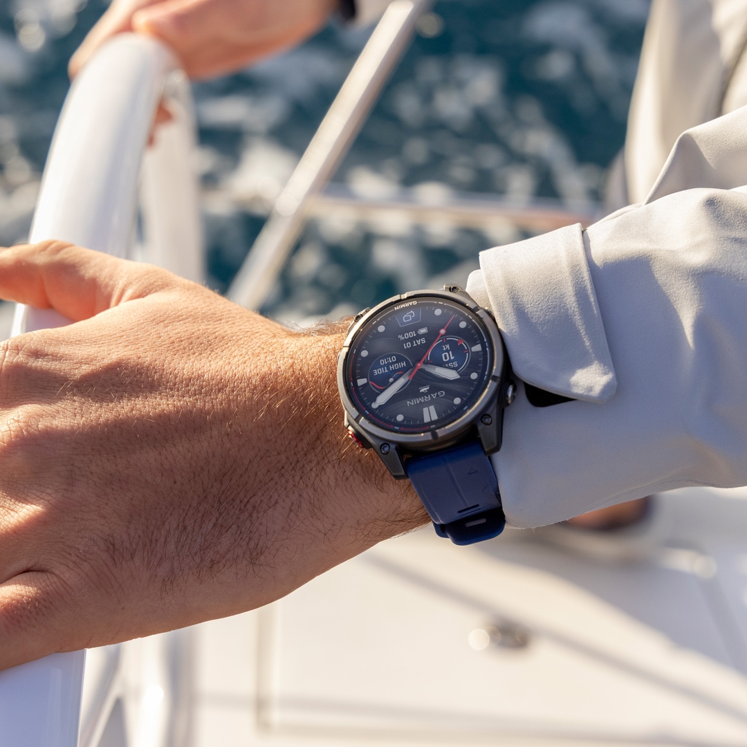 Für das Leben auf dem Wasser gemacht: Tauchzertifizierung, wasserdichte Tasten, ein Sensorschutz aus Metall und ein helles, 1,4‑Zoll AMOLED-Display mit kratzfestem Glas und Titanium Lünette. - Bootsmodus
