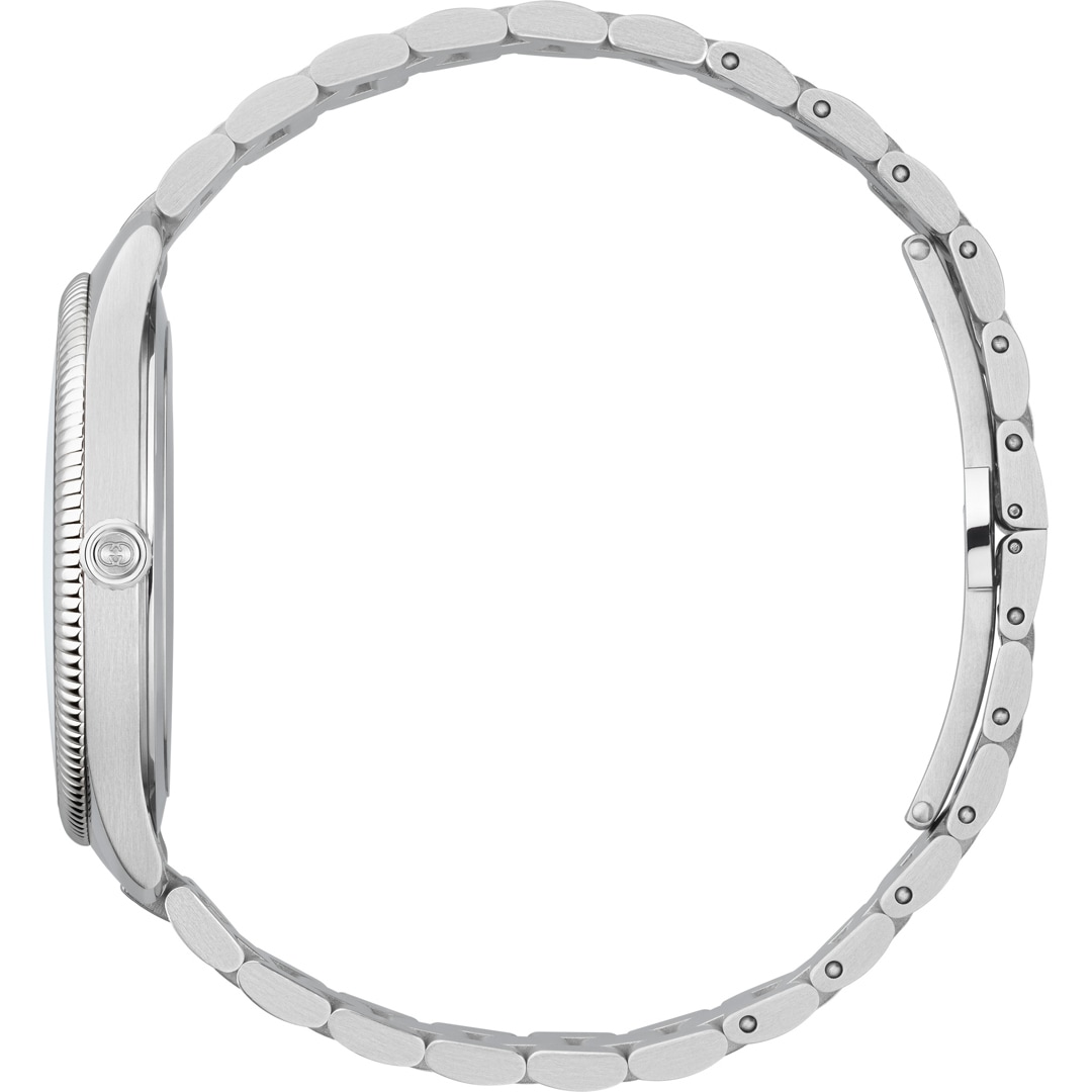 Die G-Timeless Linie mit charakteristischen Motiven des Hauses nimmt auch in den aktuellen Gucci Kollektionen eine essenzielle Rolle ein. Dieses Modell mit Quarzwerk verfügt über ein silberfarbenes Zifferblatt sowie ein Armband aus Edelstahl. Das symbolträchtige GG setzt einen eleganten Logo-Akzent.