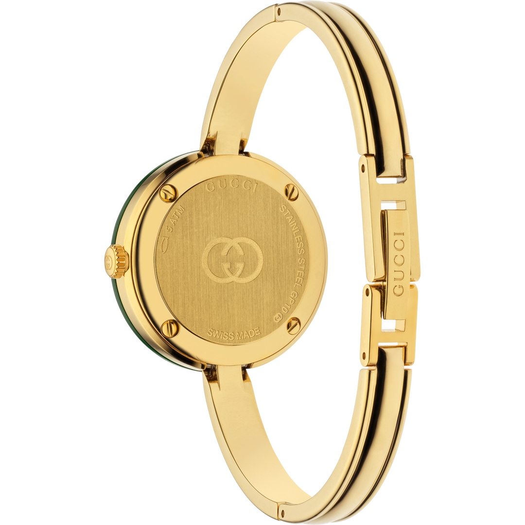 Die Gucci Play Uhrenkollektion umfasst geradlinige Silhouetten, die dank ihrer austauschbaren Keramiklünette vielseitige Stylingvarianten bieten. Neben einem Quarzwerk verfügt dieses Modell über einen goldfarbenen Armreif und ein weisses Zifferblatt mit charakteristischen Symbolen des Hauses.