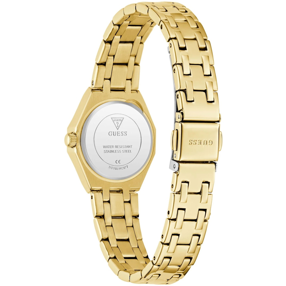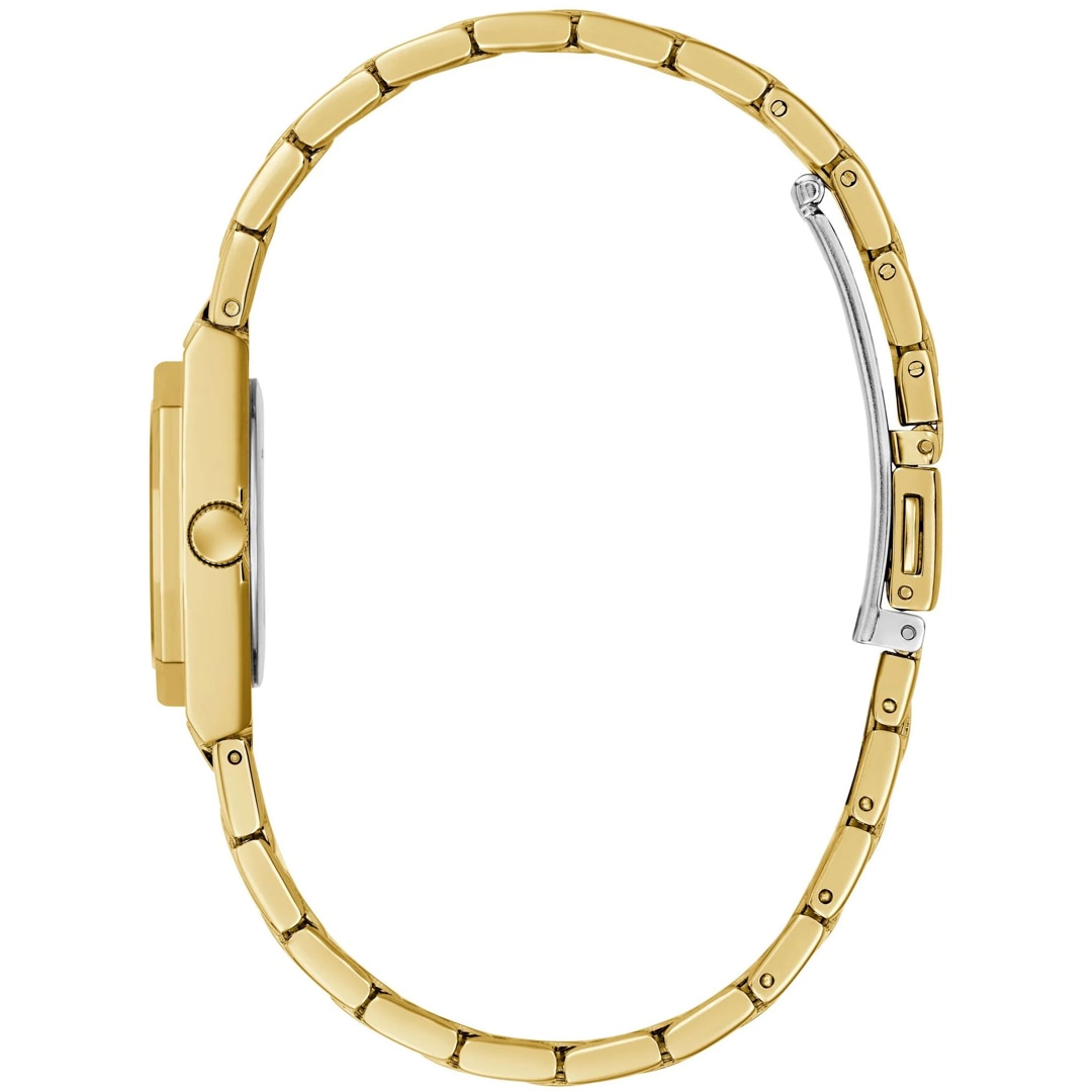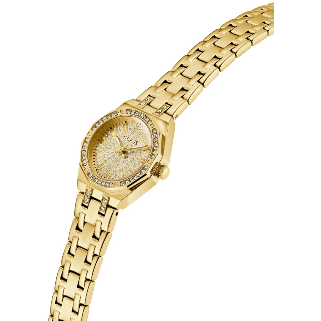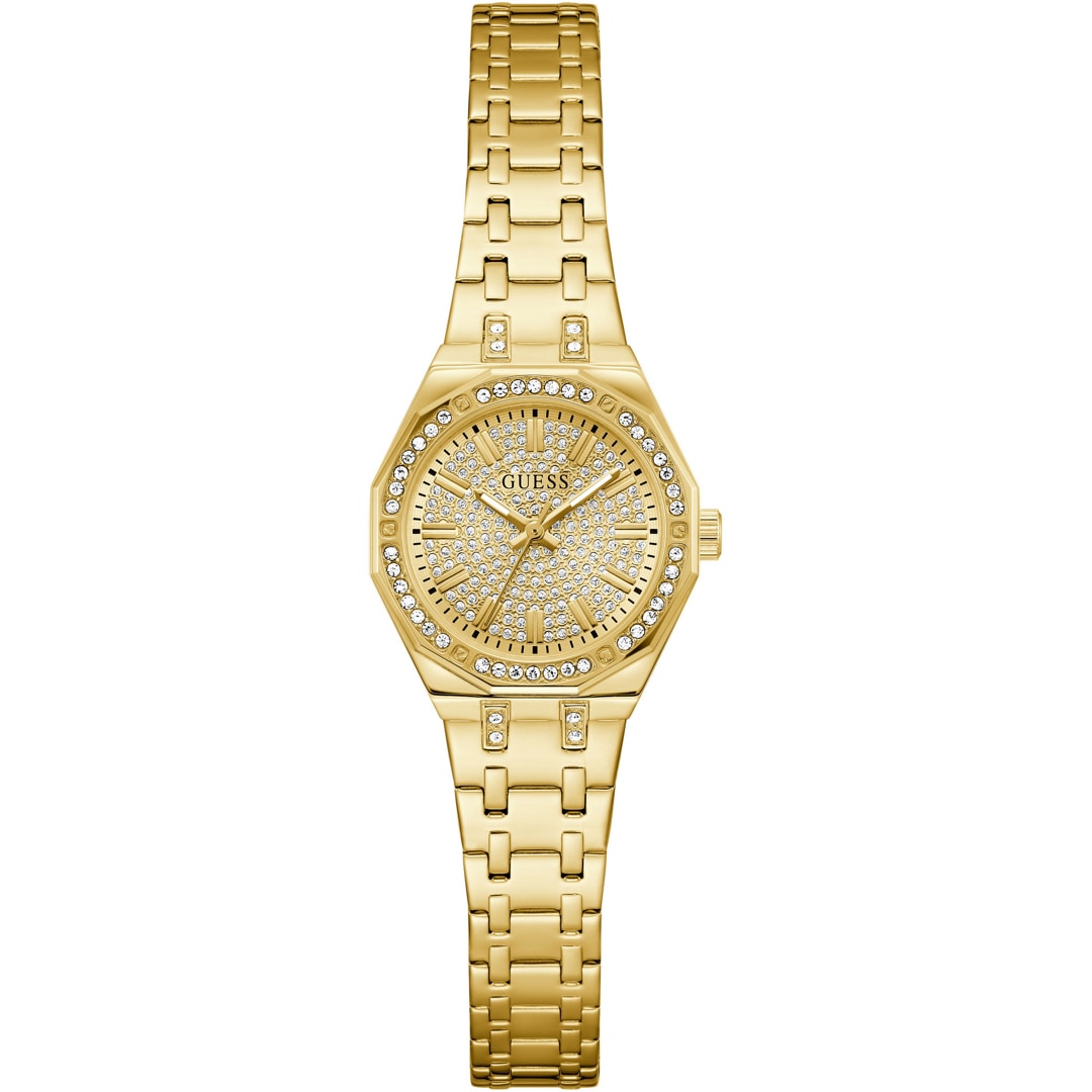 Die PIXIE von GUESS ist eine elegante Verbindung von Glamour und Zierlichkeit. Das Edelstahlgehäuse sowie das zarte Armband zeichnen das Design dieser Uhr aus. Feine Kristalle zieren Lünette, Zifferblatt und Bandanstösse dieser femininen Damenuhr. Ihre versprühen eine extra Note Charme.