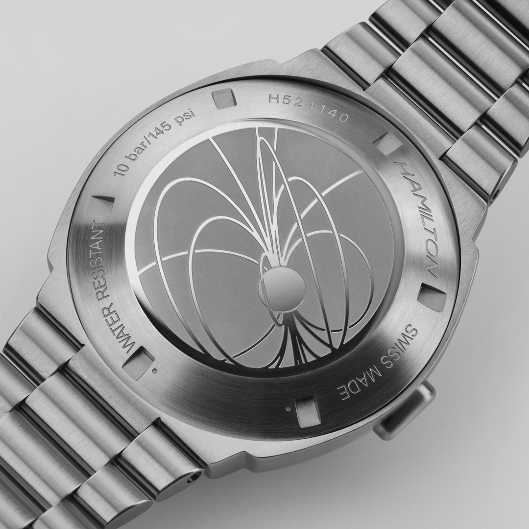 Einer der Unterschiede zu den Vorgängerversionen ist die Zeitanzeige. Die Hamilton PSR ist mit einem Hybrid-Display ausgestattet, das die Technologien der reflektierenden Flüssigkristallanzeige (LCD) und der emittierenden organischen Leuchtdioden (OLED) kombiniert. Beim Betätigen des Drückers werden wieder die grünen OLED-Ziffern in der bekannten Form als ‚digitale Punkte‘ angezeigt, während das LCD-Display sicherstellt, dass die Zeit auch bei Tageslicht gut ablesbar ist. Da es keine Hintergrundbeleuchtung gibt, verbraucht die Anzeige sehr wenig Energie.
