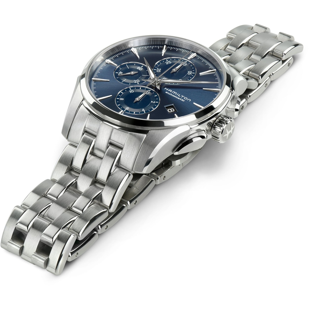 Teil der Wirkung der Jazzmaster Kollektion ist die schöne Balance zwischen zeitgemässer Ästhetik und traditioneller Uhrmacherkunst. 2019 wird die edelste aller Hamilton Kollektionen um einige neue Modelle in Form brandneuer Automatikchronographen ergänzt. Ihr Understatement-Stil ist ein Statement für sich. Das zeitgemässe Automatikchronographenwerk H-21 bietet eine Datumsanzeige und eine Gangreserve von 60 Stunden. Das Uhrwerk basiert auf dem traditionellen Kaliber ETA 7750, das für seine Qualität bekannt ist. Hamilton hat es angepasst und noch leistungsstärker gestaltet, um den Anforderungen des modernen Lebens gerecht zu werden. Die polierten Edelstahlgehäuse besitzen maskuline Proportionen, sind aber mit einem leicht gerundeten Profil subtil gestaltet. Das Saphirglas schützt Zifferblätter mit Sonnenschliff in Weiss, Anthrazit und Blau, die sich durch ihre Tiefe auszeichnen und das Hauptzifferblatt und die Chronographenzähler durch kontrastierenden Glanz voneinander absetzen. Ergänzt wird dieses Erscheinungsbild durch Lederarmbänder in Camel, Grau und Braun mit einem traditionellen Alligator-Printmuster und matter Beschichtung, um dem klassischen Armband einen zeitgenössischen Look zu verleihen. Der Name Jazzmaster spiegelt Hamiltons American Spirit wider. Ihre amerikanischen Wurzeln können bis ins Jahr 1892 nach Lancaster, Pennsylvania, zurückverfolgt werden. Der Jazz wurde zur gleichen Zeit geboren und verband eine Vielfalt musikalischer Stilrichtungen, um daraus einen neuen, aufregenden Sound entstehen zu lassen. Die Jazzmaster ist eine Hommage an jene Anfangstage von Hamilton. Hamiltons American Spirit fliesst durch alle Kollektionen und spiegelt sich in jedem Modell wider, das sie entwickeln. Als Held der Jazzmaster-Geschichte ist der Automatikchronograph der Inbegriff des American Spirit, perfekt ergänzt durch Schweizer Präzision.