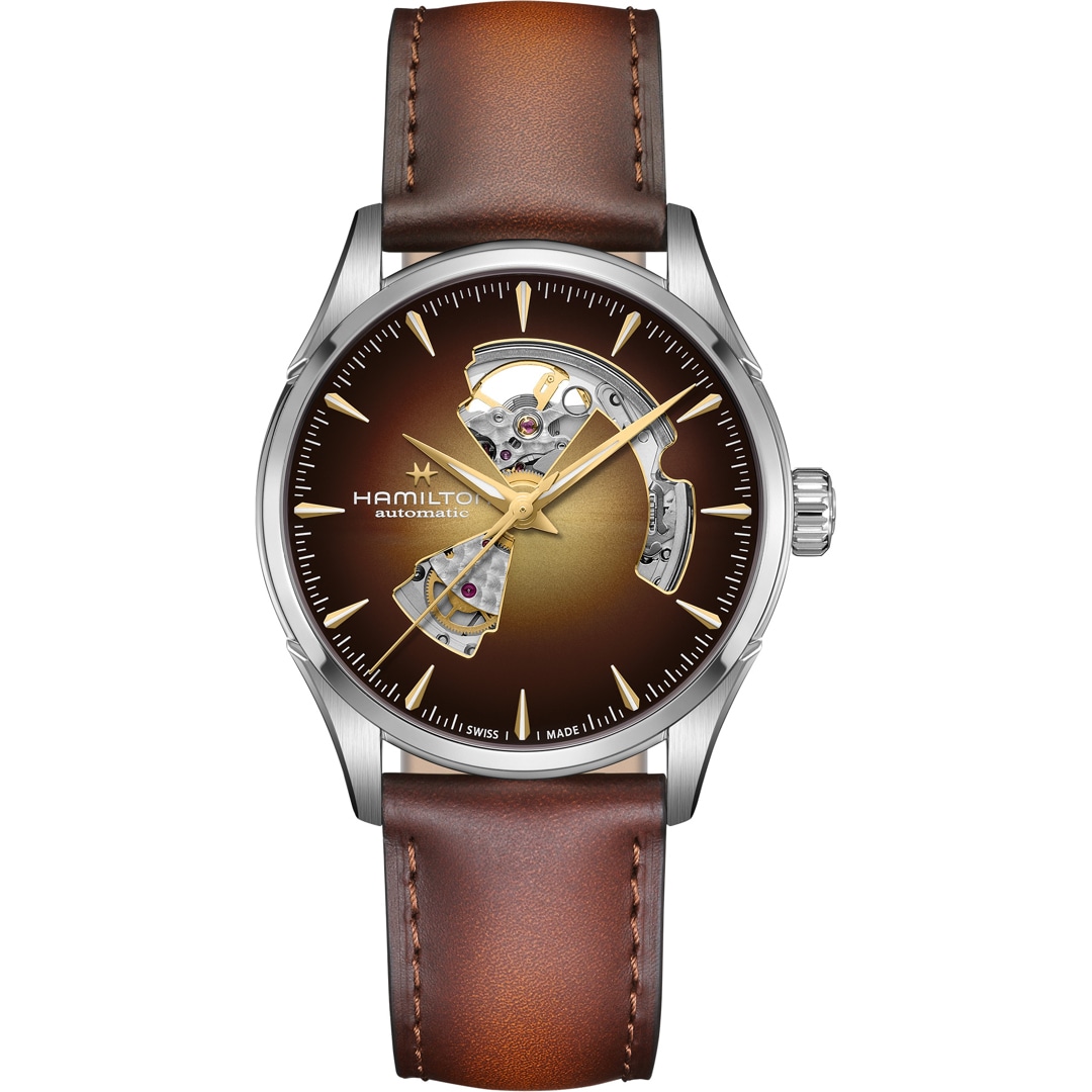 Einladend und zeitlos präsentiert sich die Jazzmaster Open Heart 42 mm mit einem rauchig-braunen Zifferblatt, das Wärme und Tiefe ausstrahlt. Das Open-Heart-Design gibt den Blick auf die präzise Mechanik im Inneren frei, während ein edles braunes Lederarmband einen klassischen Akzent setzt. Eine klassische Dresswatch, die moderne Eleganz mit anspruchsvollem Stil vereint.