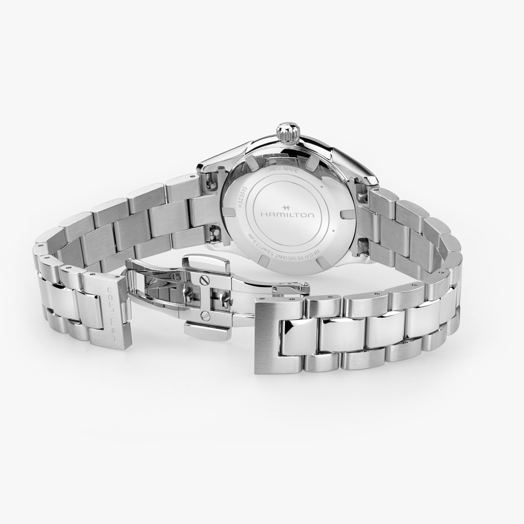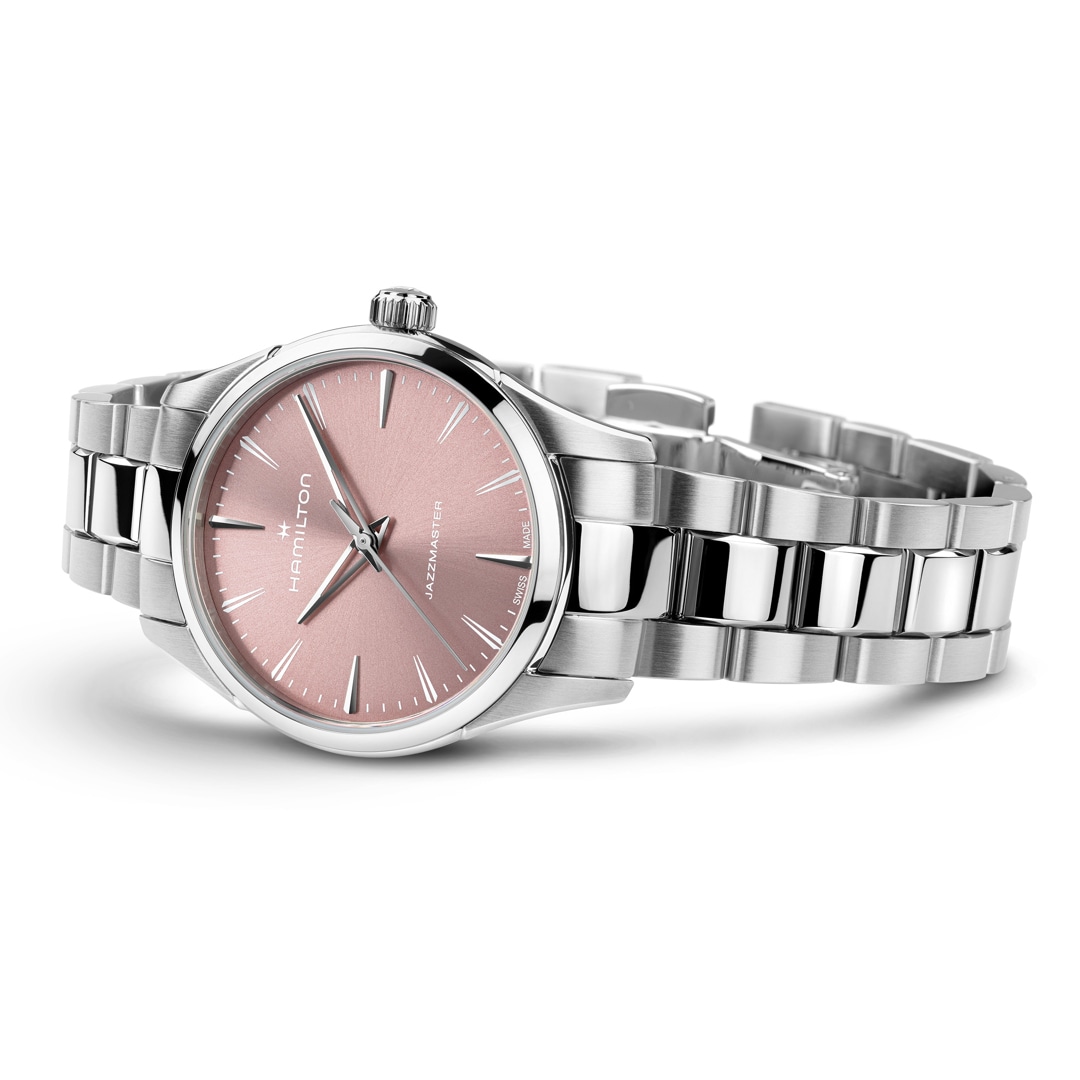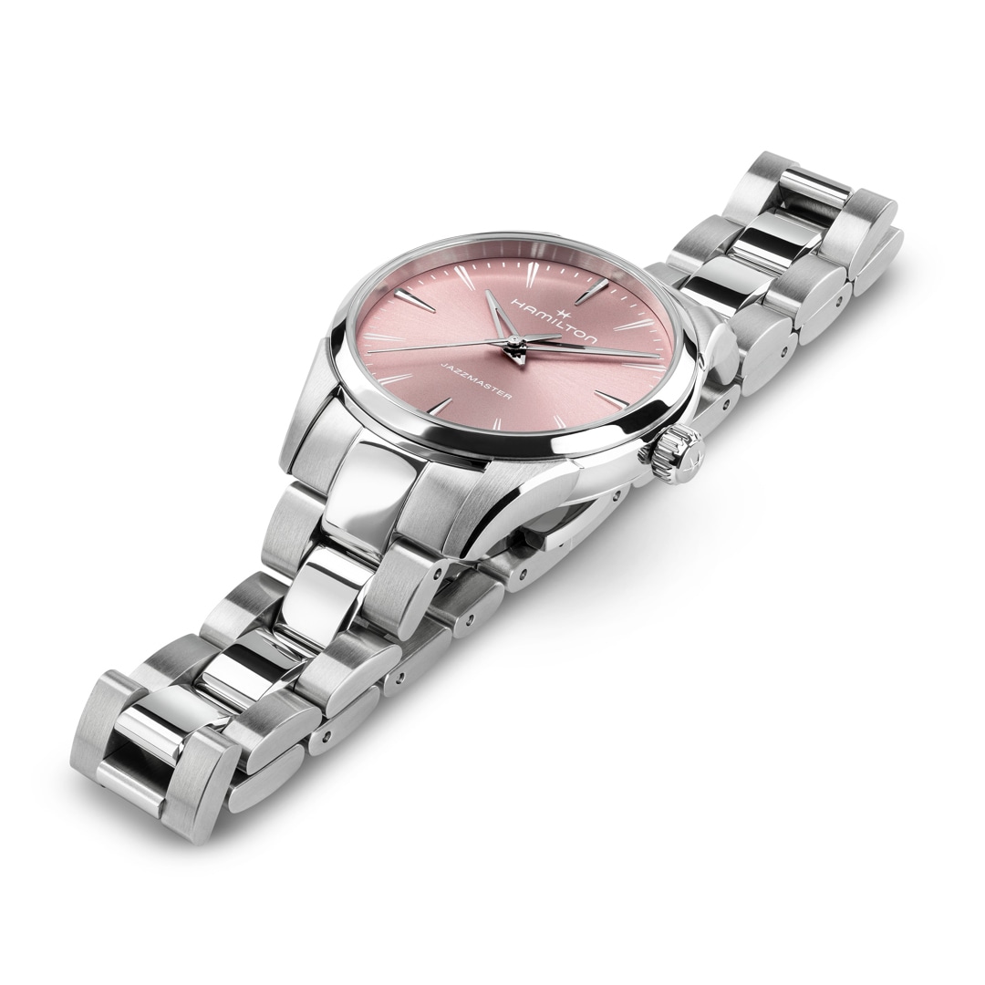 Stilvoll und frisch präsentiert sich die Jazzmaster Quartz 32 mm mit einem gebürsteten Zifferblatt mit Sonnenschliff in zartem Rosé sowie skelettierten Dauphine-Zeigern, die dem traditionellen Design eine moderne Note verleihen. Das ultraflache Gehäuse sowie die gebürsteten und polierten Details lassen eine stilvolle Optik entstehen. Eine klassisch-elegante Uhr, die jugendliche Energie mit zeitloser Raffinesse vereint.