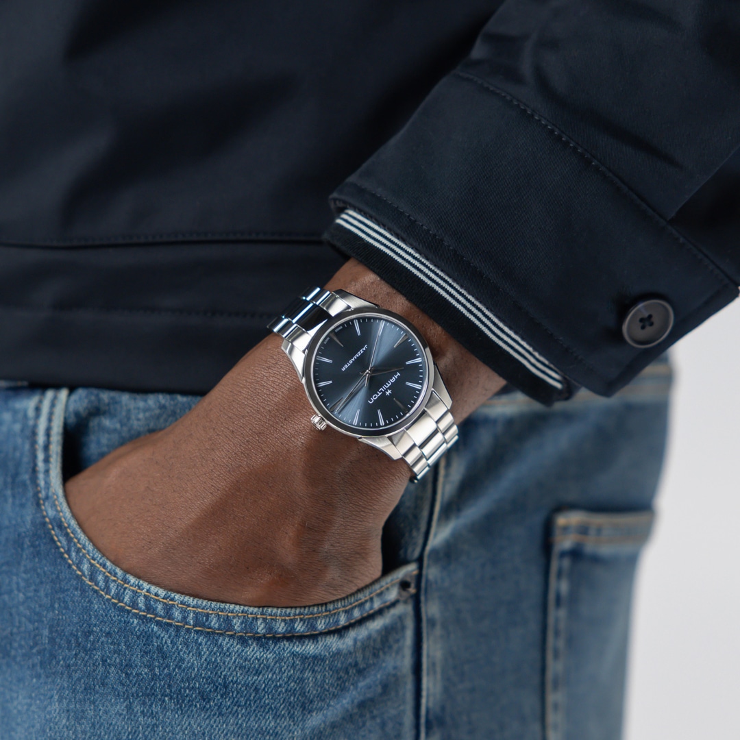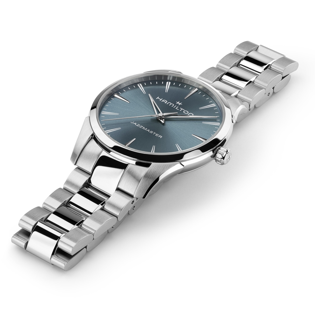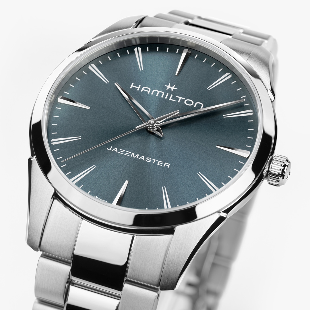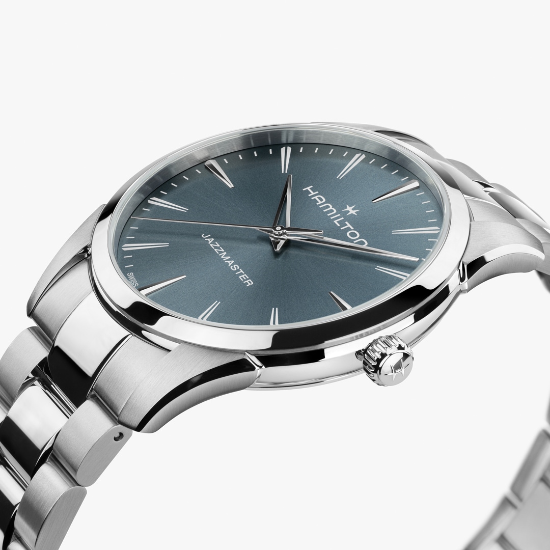 Die markante und zugleich stilvolle Jazzmaster Quartz 40 mm verfügt über ein Zifferblatt in intensivem Nachtblau, das ein dezentes Statement setzt. Das ultraflache Gehäuse sowie die gebürsteten und polierten Details betonen die klaren Linien des Designs, während skelettierte Zeiger die moderne Optik abrunden. Eine Uhr, die Farbe und Eleganz mühelos in Einklang bringt.