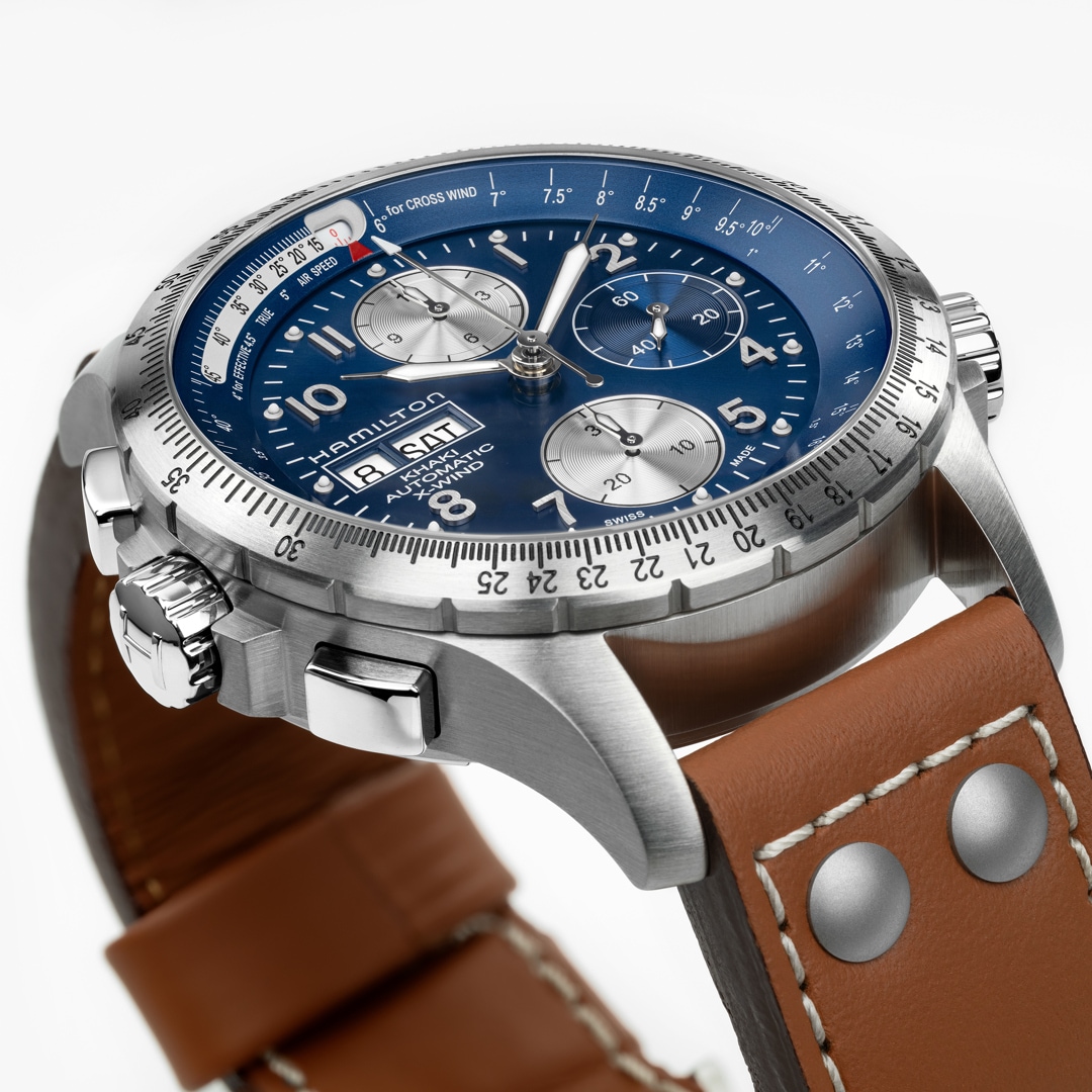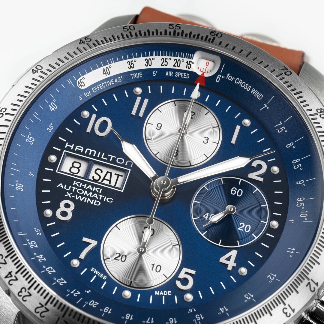 Die Khaki Aviation X-Wind Day Date Autochrono wurde für Piloten entwickelt und für Abenteuer geschaffen. Sie fliegt mit einem kühnen neuen Look durch die Seitenwinde. Mit ihrem markanten blauen Zifferblatt, einer drehbaren Innenlünette und der 60-Stunden-Gangreserve wird diese Hochleistungsuhr von unserem H-21-Uhrwerk angetrieben und ist der perfekte Begleiter für alle, die bei den Abenteuern des Lebens auf Präzision und Flair setzen.
