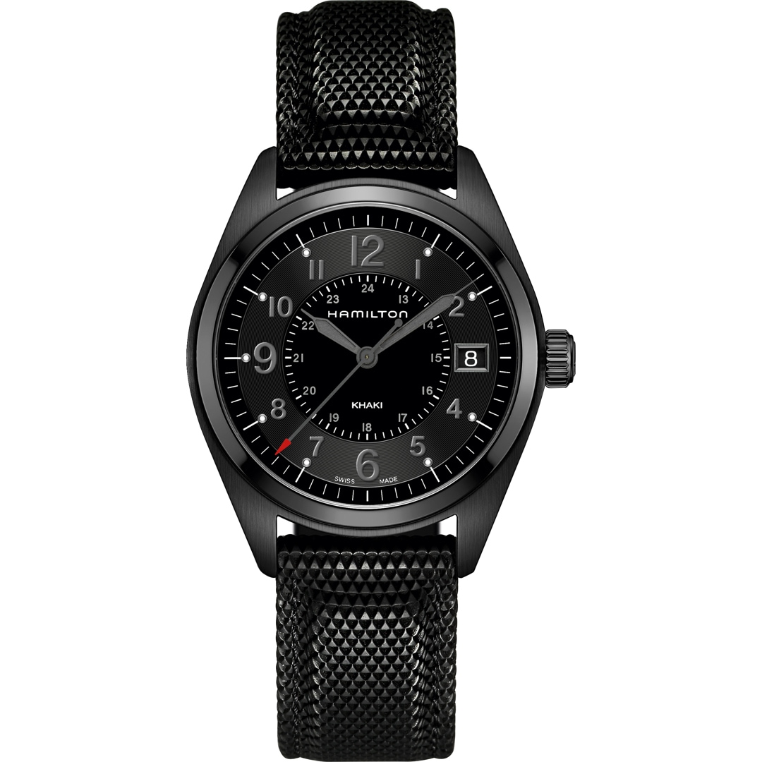 Full Black! - Die neue Khaki Field ist komplett in schwarz gehalten. Das PVD-schwarze Edelstahlgehäuse des eleganten Zeitmessers umschliesst ein schwarzes Zifferblatt. Ein höchst strapazierfähiges Armband aus feinstem Textil, welches sich in jeder Situation bewährt, sorgt zudem für einen sehr angenehmen Tragekomfort. Schwarz beschichtete Zeiger und Indexe runden die edle Optik dieser Khaki Field ab. Wer mit der Uhr selbst vor Wasser nicht halt macht, ist mit 5 bar Wasserdichtheit, auf der sicheren Seite. Robust und leistungsstark - wie gemacht für alle Abenteuerlustigen.