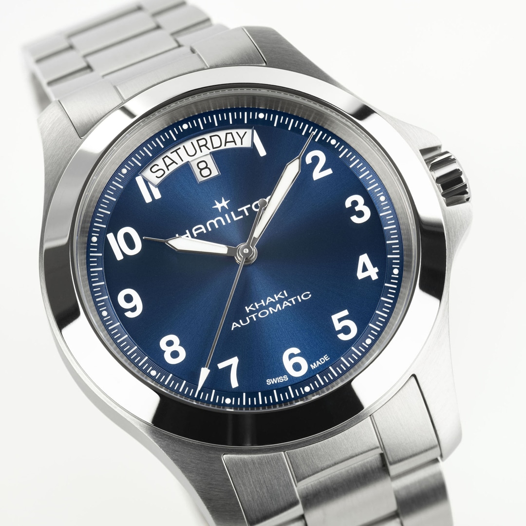 Robust und elegant zugleich interpretiert die Khaki Field King 40 mm eine Militärikone für den Alltag neu. Das blaue, gebürstete Zifferblatt mit Sonnenschliff verfügt über markante arabische Ziffern und eine charakteristische Tages- und Datumsanzeige bei 12 Uhr. Es wird von einem Gehäuse aus gebürstetem Edelstahl umschlossen und durch ein Armband mit EasyClick-Verstellsystem abgerundet. Dank der verbesserten Wasserdichtigkeit von 10 bar und des entspiegelten Saphirglases bietet diese Outdoor-Uhr überragende Robustheit und Funktionalität unter allen Bedingungen. Ein moderner Klassiker – kreiert für freie Stunden, verwurzelt in traditionellem Design.